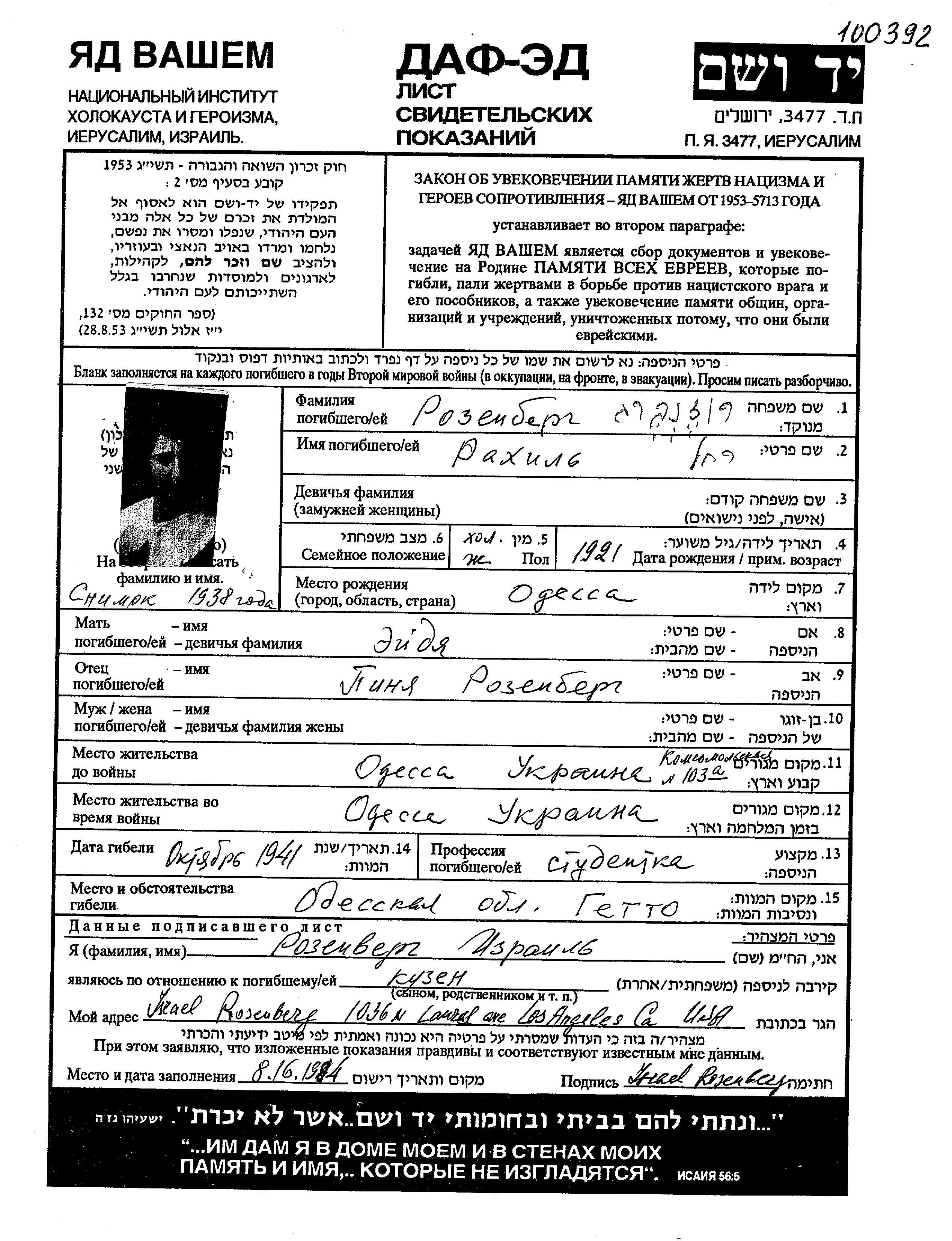 Rozenberg Rakhil 1921 Odessa, Ukraine (URSS) Feuille de témoignage