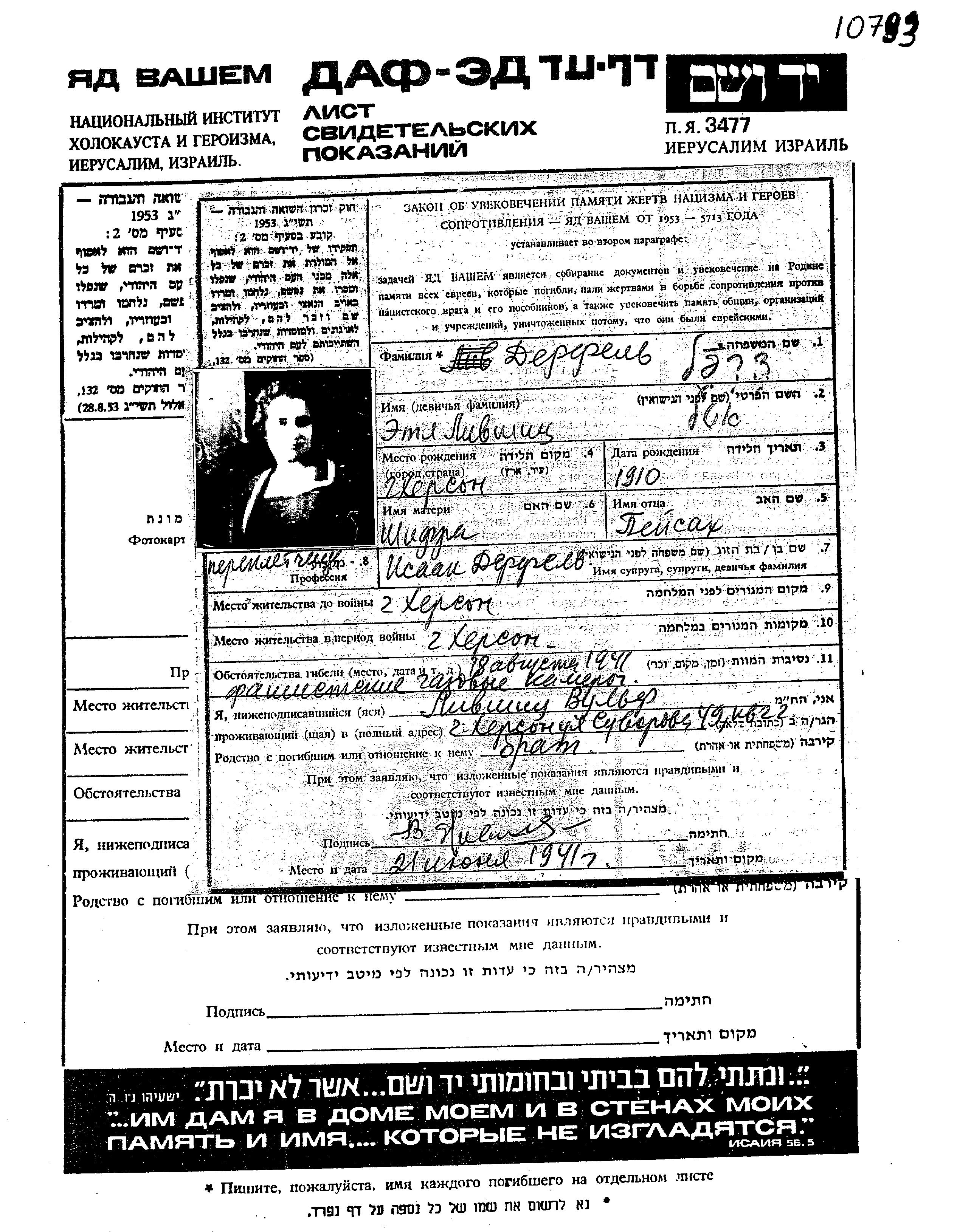 Etl Derfel Drapel née Livshitz est née à Kherson, Ukraine (URSS) en 1910. Elle était Ouvrier/e. Avant la seconde guerre mondiale elle vivait à Kherson, Ukraine (URSS). Etl a été assassinée pendant la Shoah. Lieu de la mort: endroit inconnu en 18/08/1941.