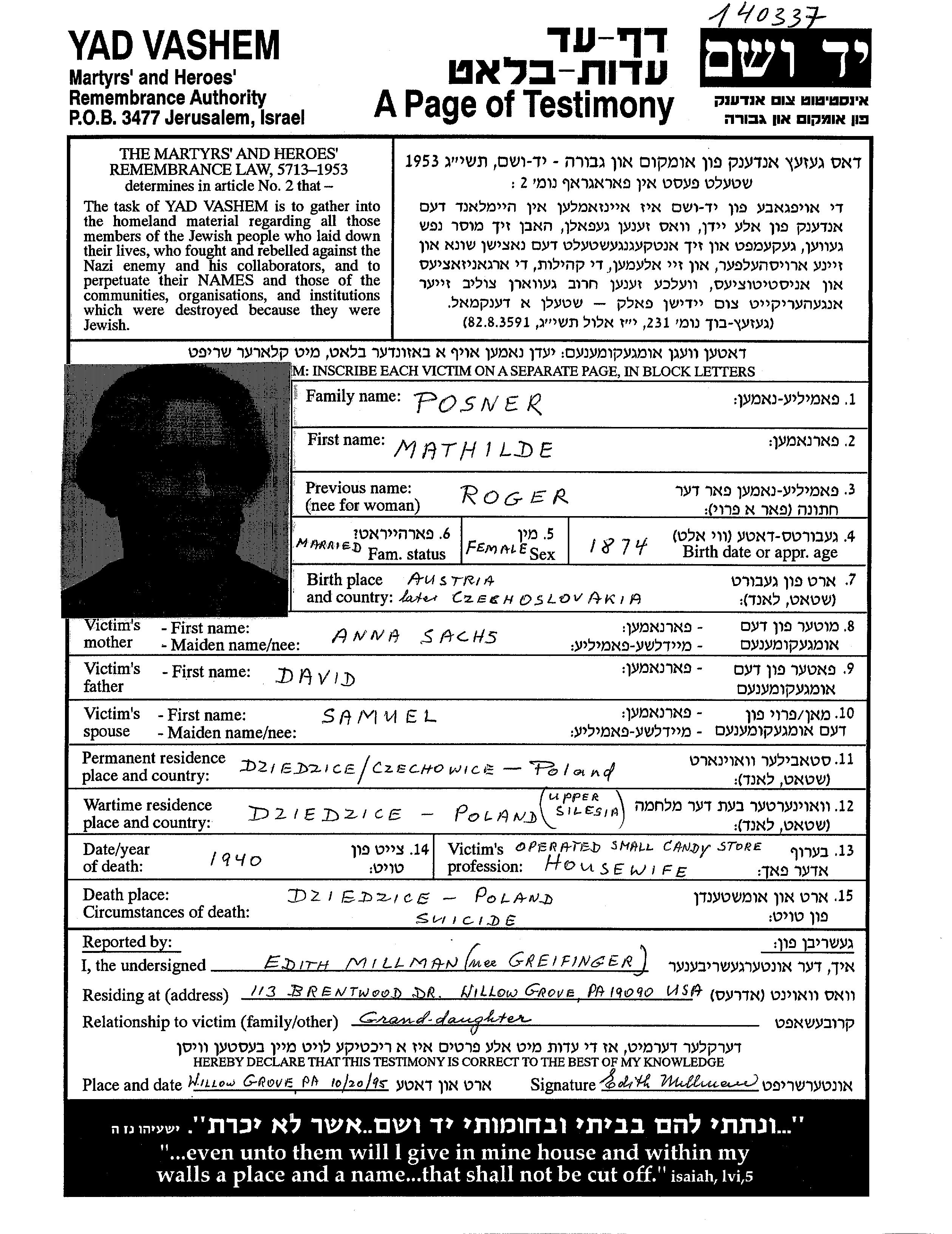 Mathilda Posner née Roger est née à Tchécoslovaquie en 1874. Elle était Femme au foyer. Avant la seconde guerre mondiale elle vivait à Dziedzice, Pologne.