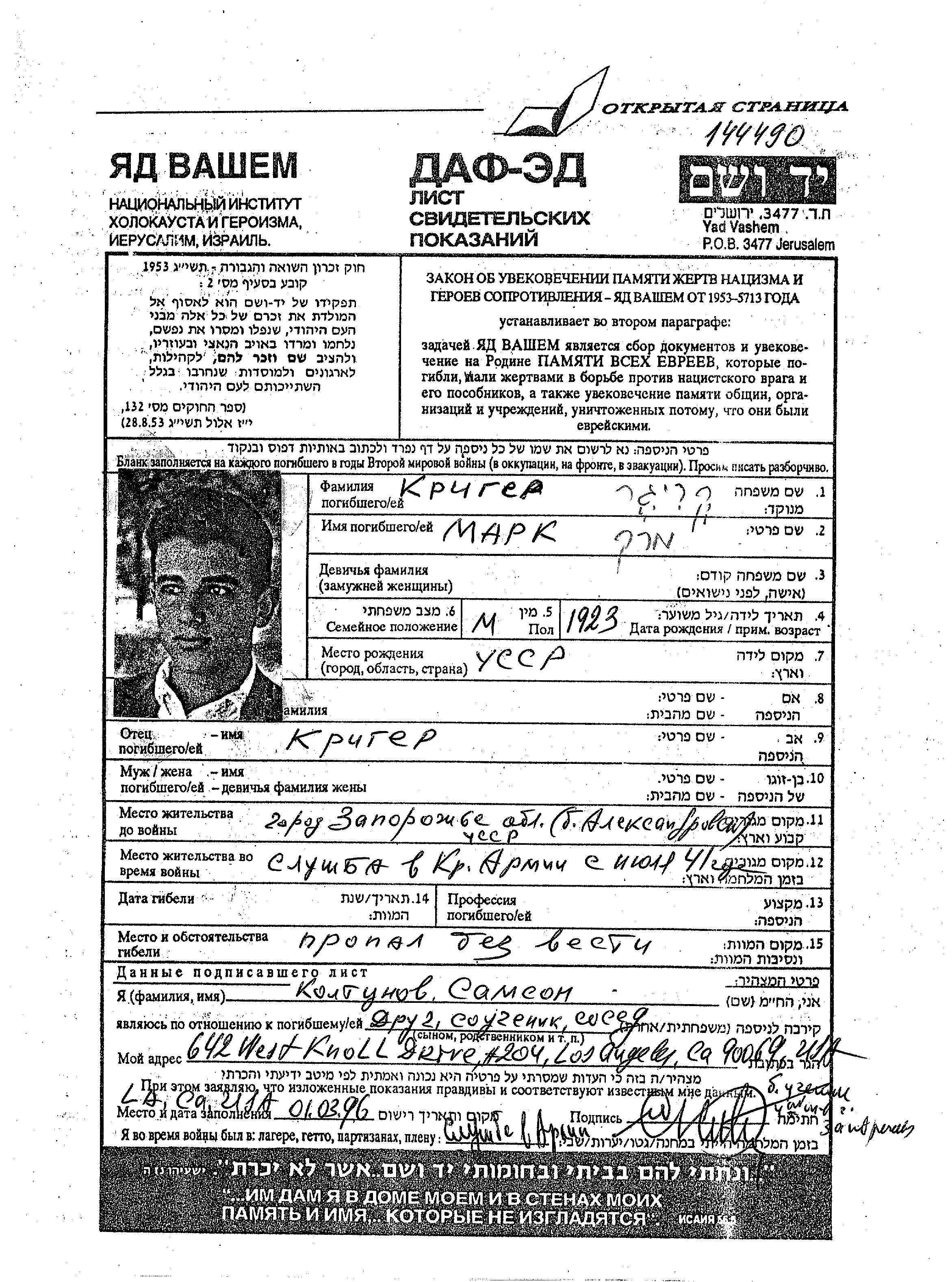 Mark Kriger est né à Ukraine (URSS) en 1923. Avant la seconde guerre mondiale il vivait à Zaporozhye, Ukraine (URSS).