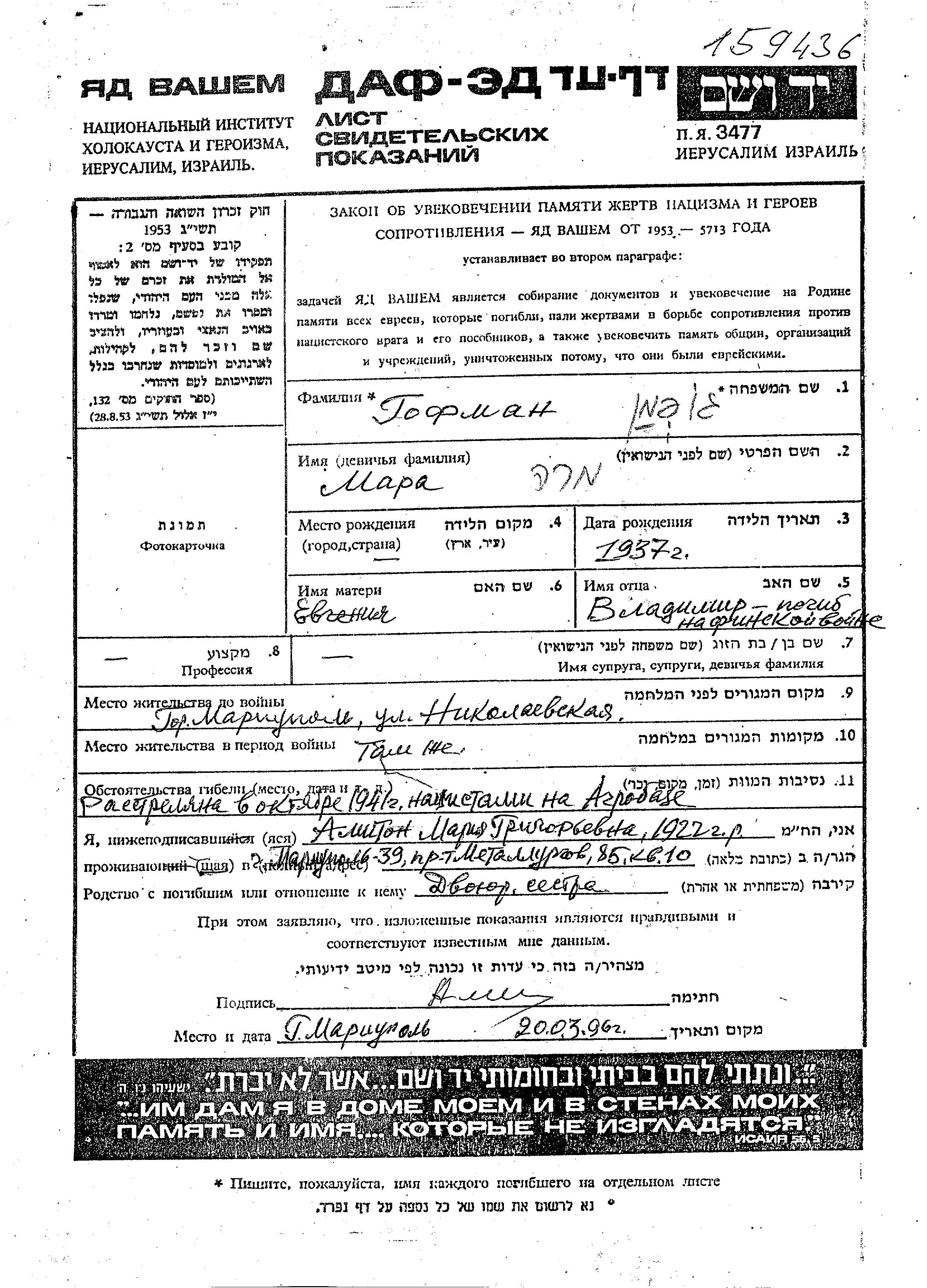 Gofman | Mara Mera | 1937 | Mariupol, Ukraine (URSS) | Feuille de témoignage |