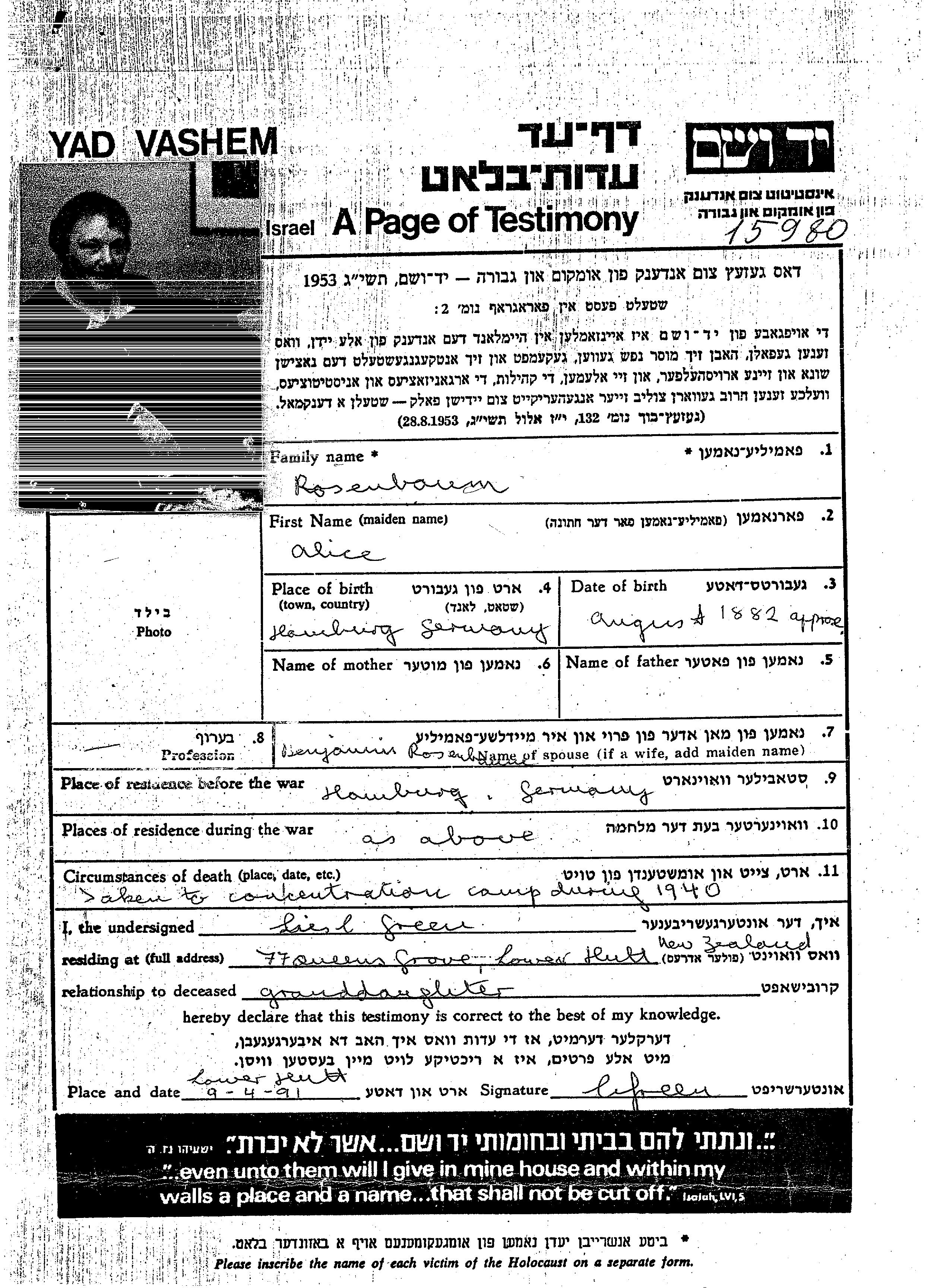 Rosenbaum Alice 1882 Hamburg, Allemagne Feuille de témoignage