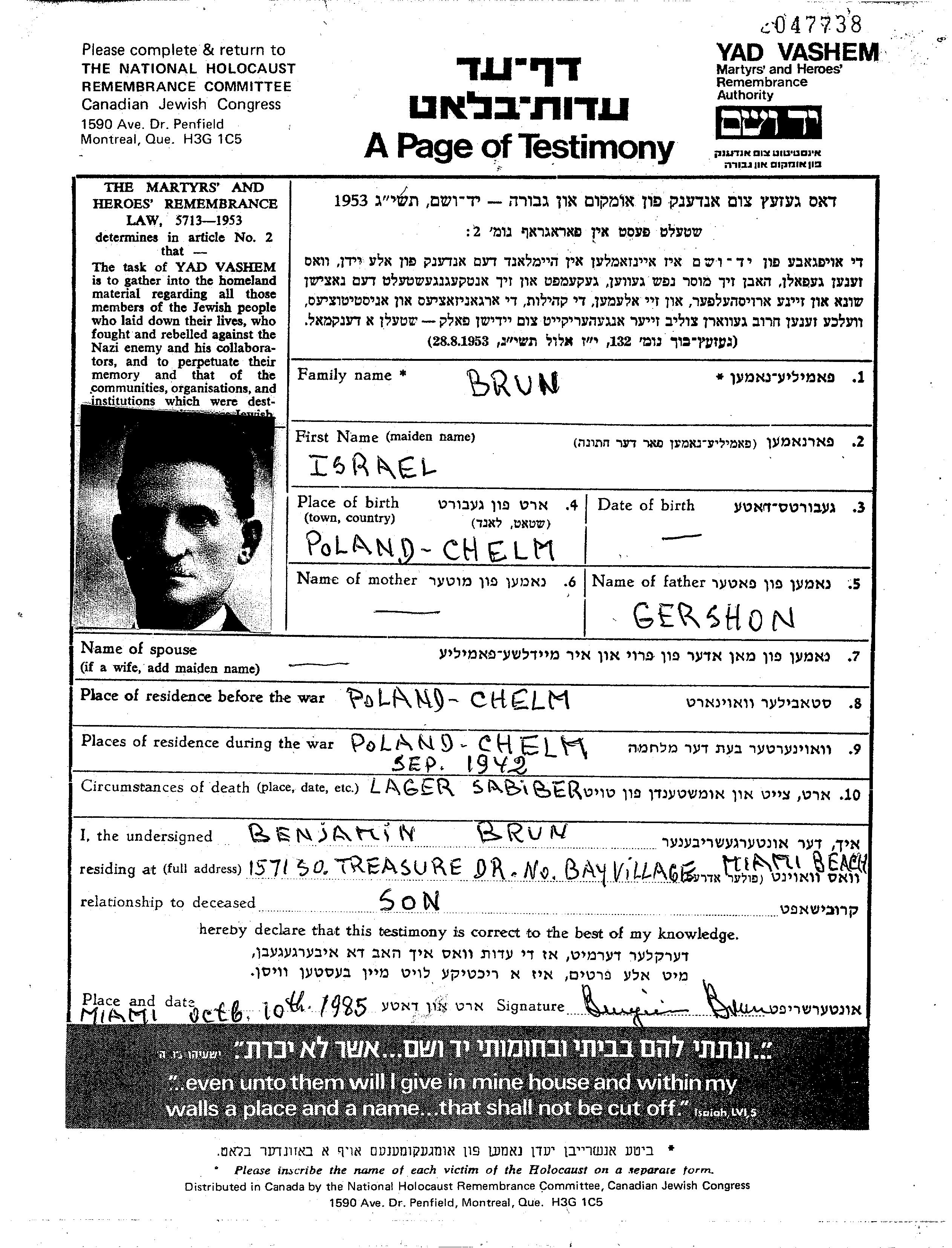 Brun Israel Chelm, Pologne Feuille de témoignage