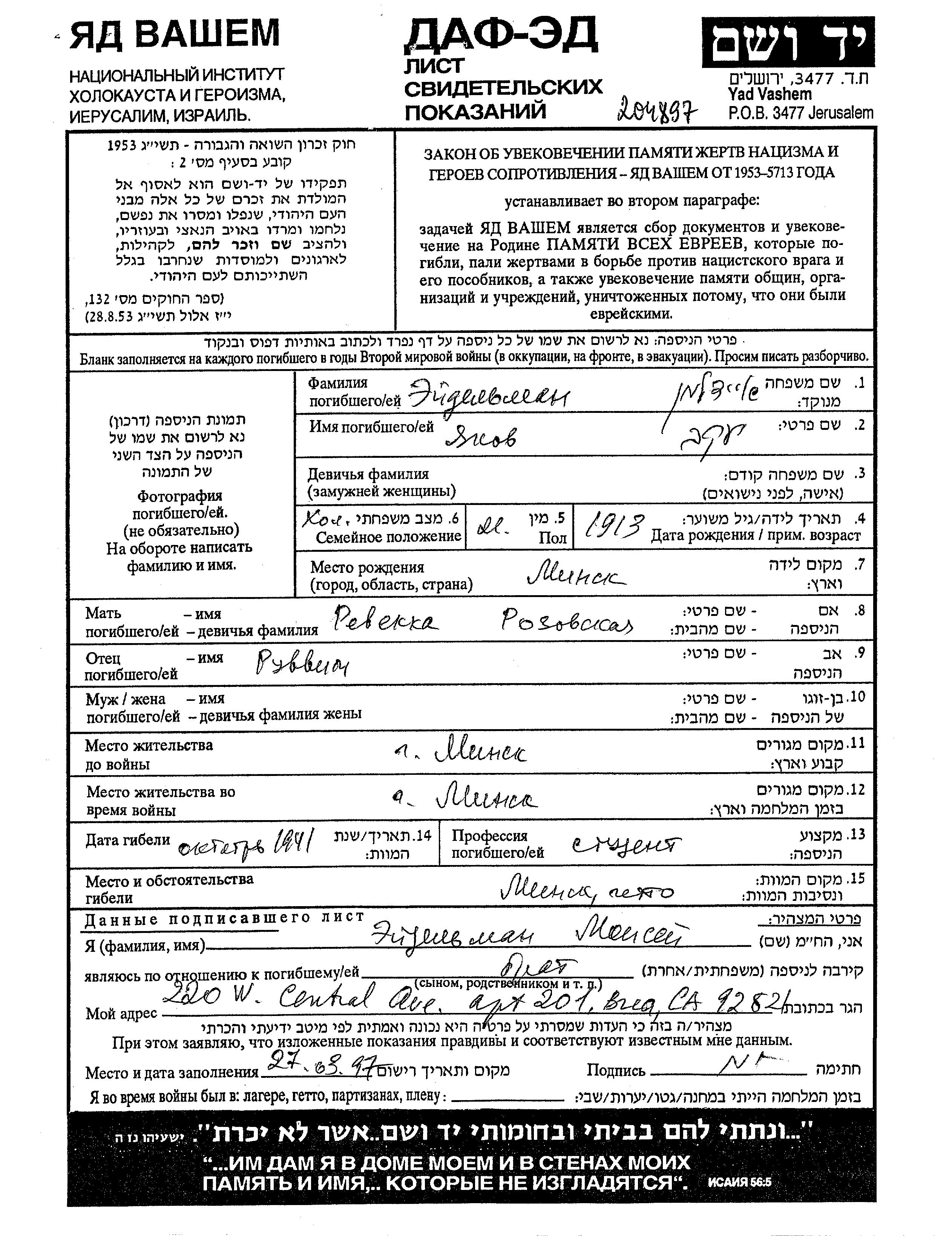 Eidelman Yakov 1913 Minsk, Bélorussie (URSS) Feuille de témoignage