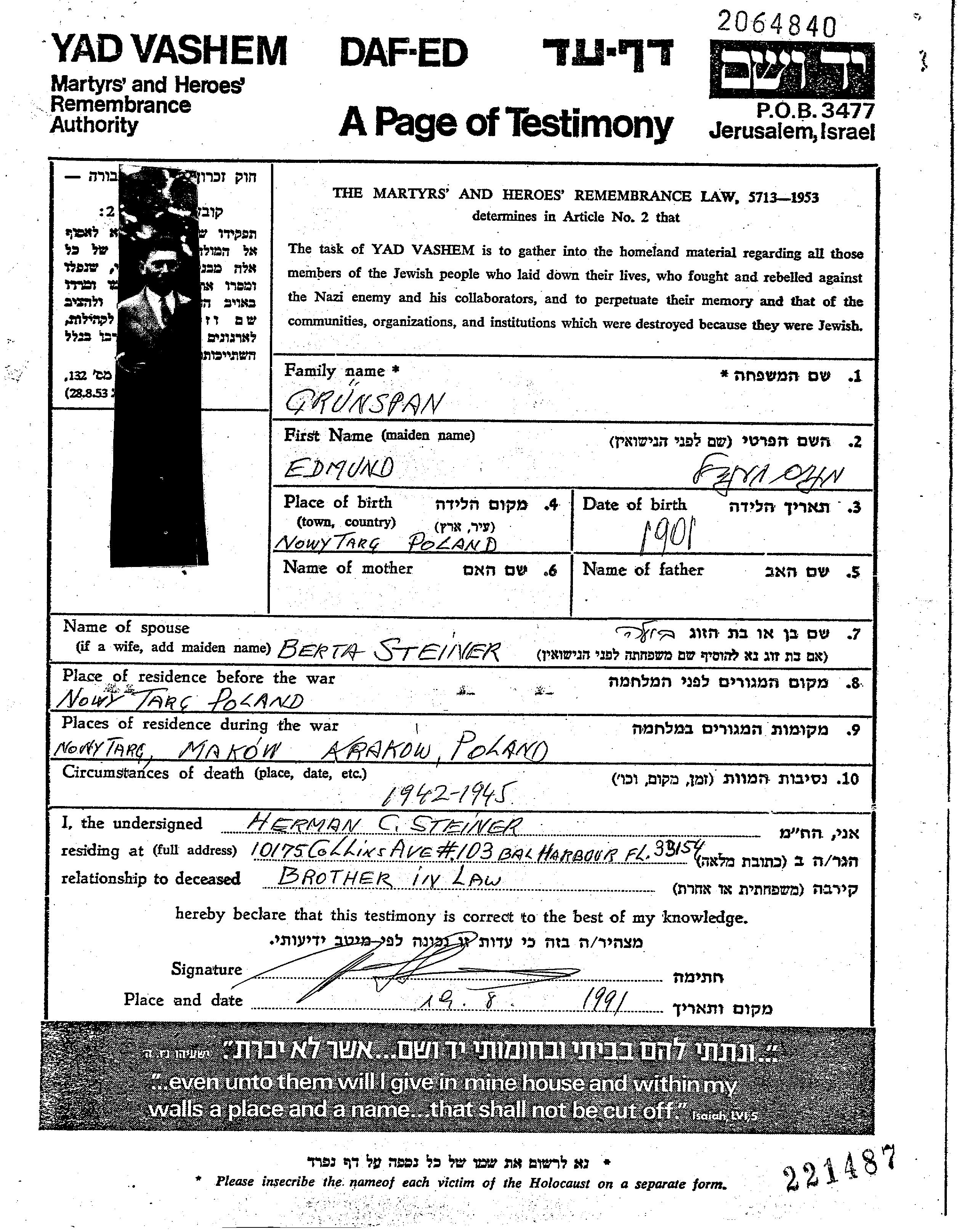 Gruenspan | Edmund Menakhem | 1901 | Nowy Targ, Pologne | Feuille de témoignage |