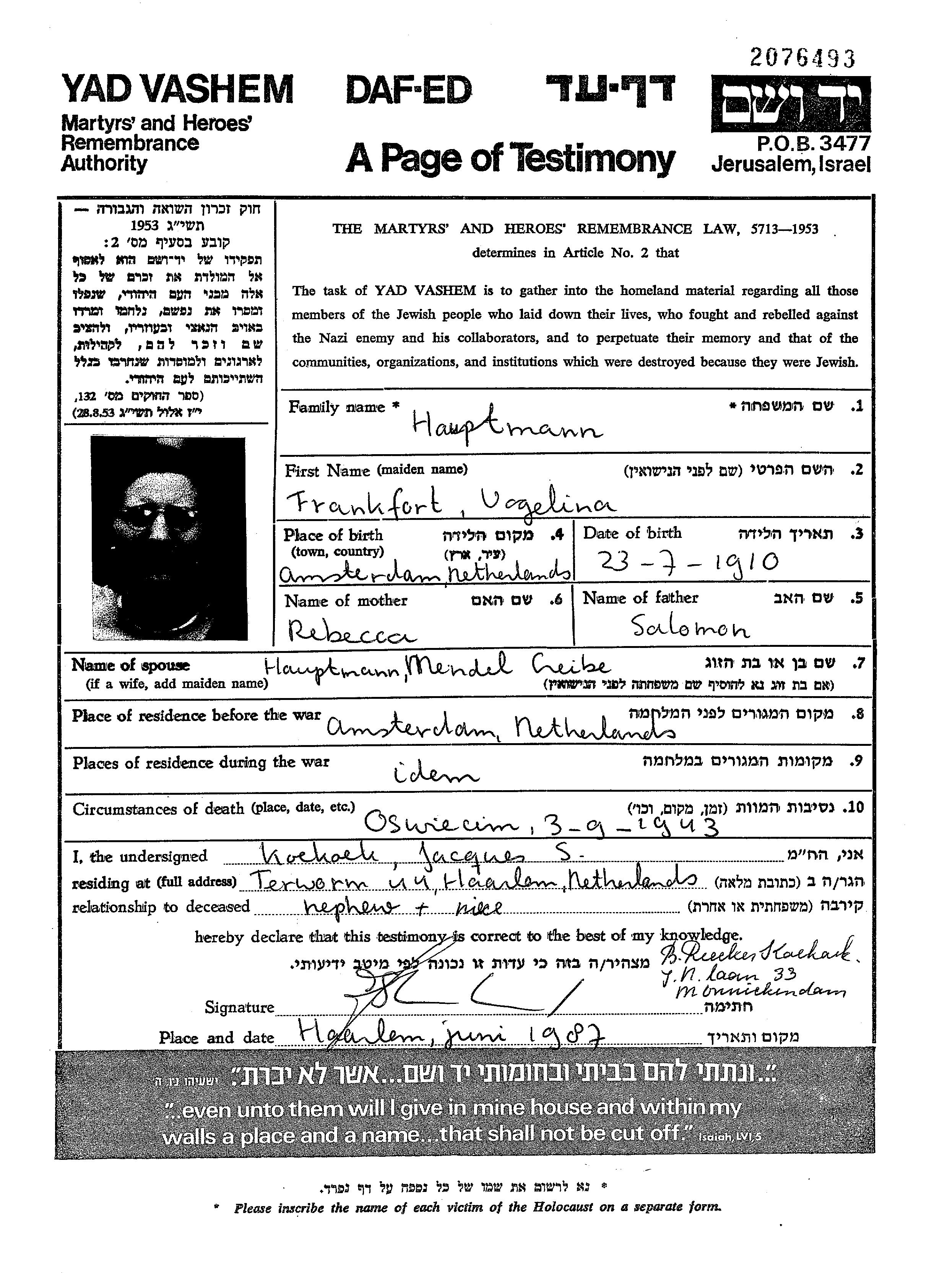 Vogelina Hauptmann née Frankfort est née à Amsterdam, Pays-Bas en 1910. Avant la seconde guerre mondiale elle vivait à Amsterdam, Pays-Bas.