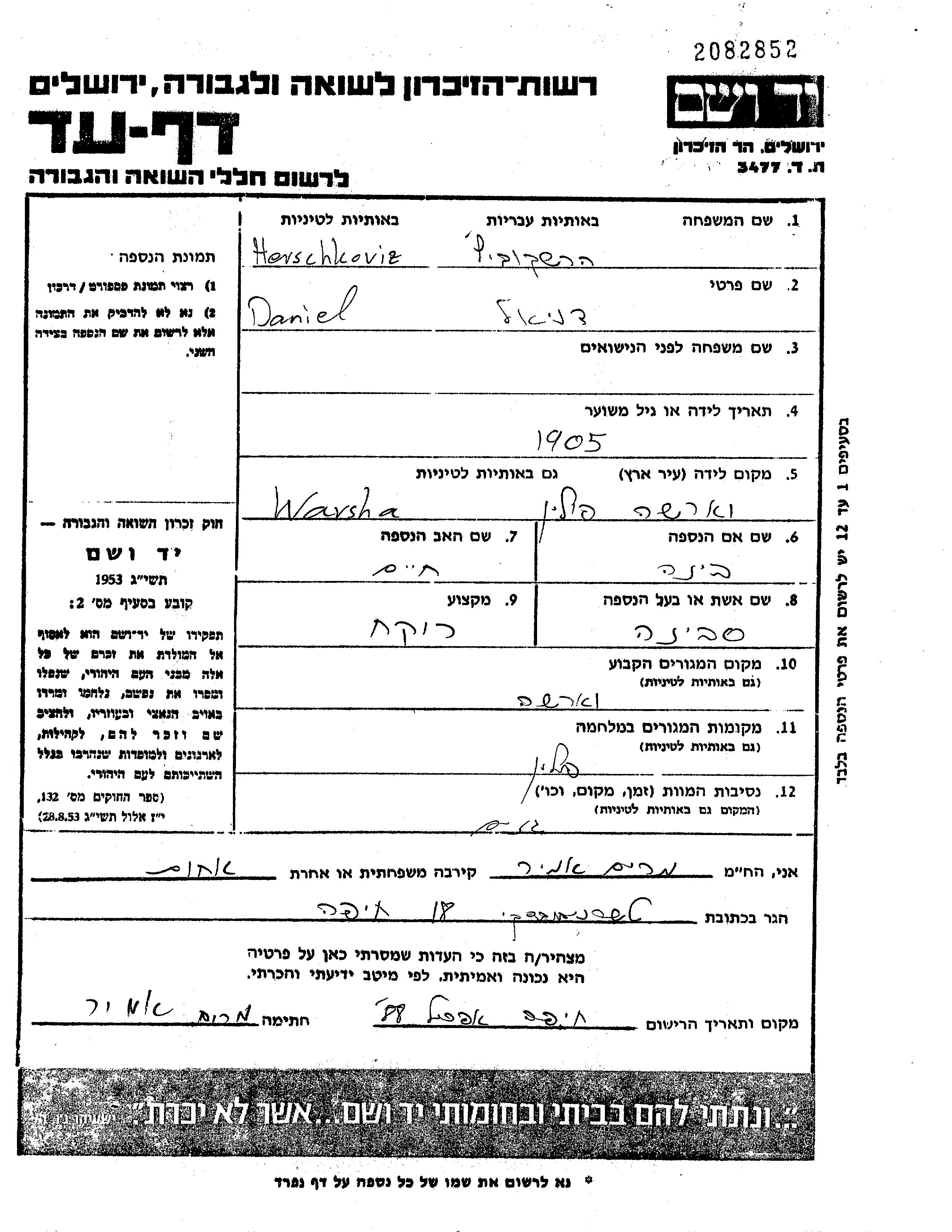 Herschkoviz Daniel 1905 Warszawa, Pologne Feuille de témoignage