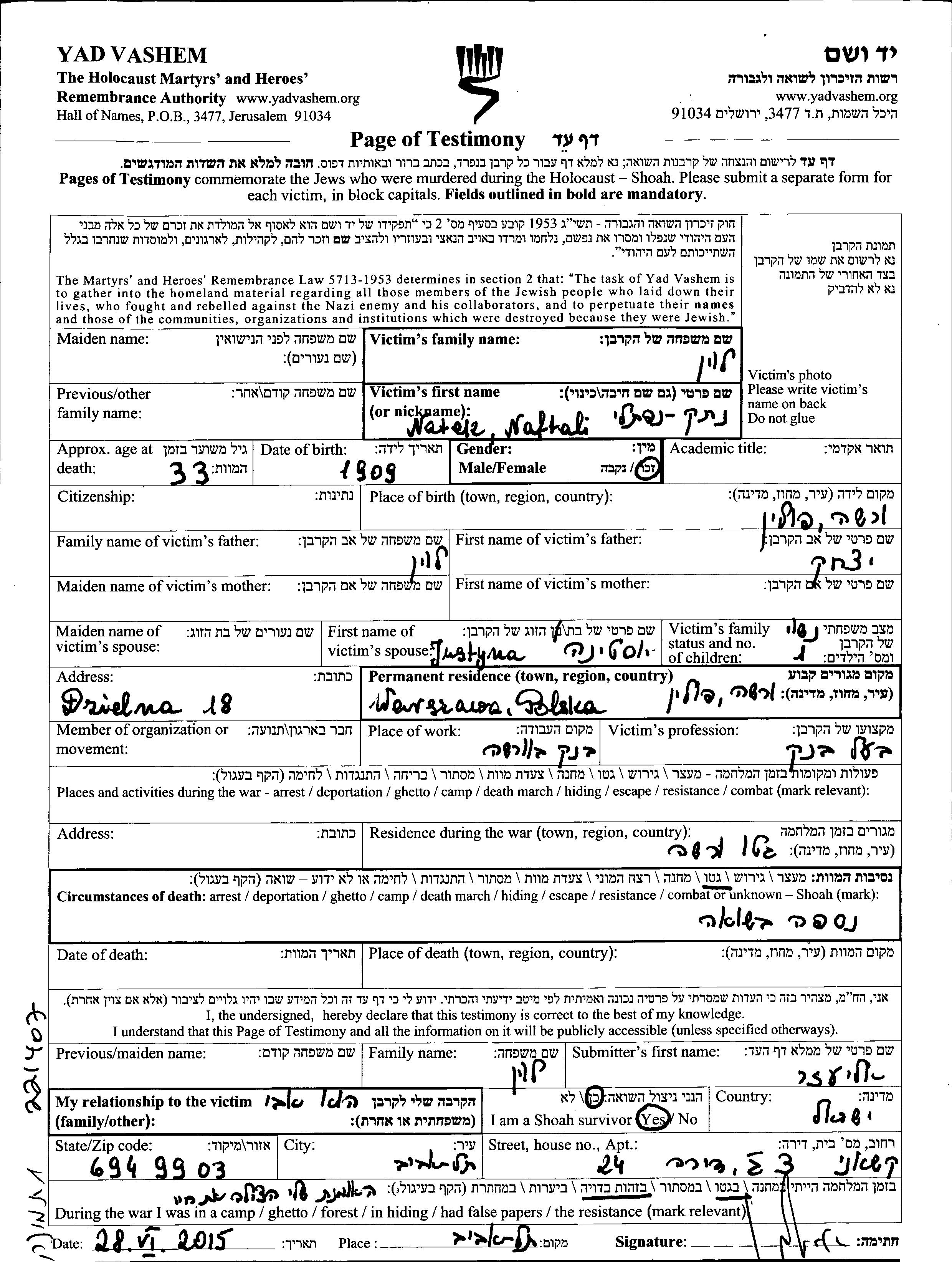 Levin Natek Naftali 1909 Warszawa, Pologne Feuille de témoignage