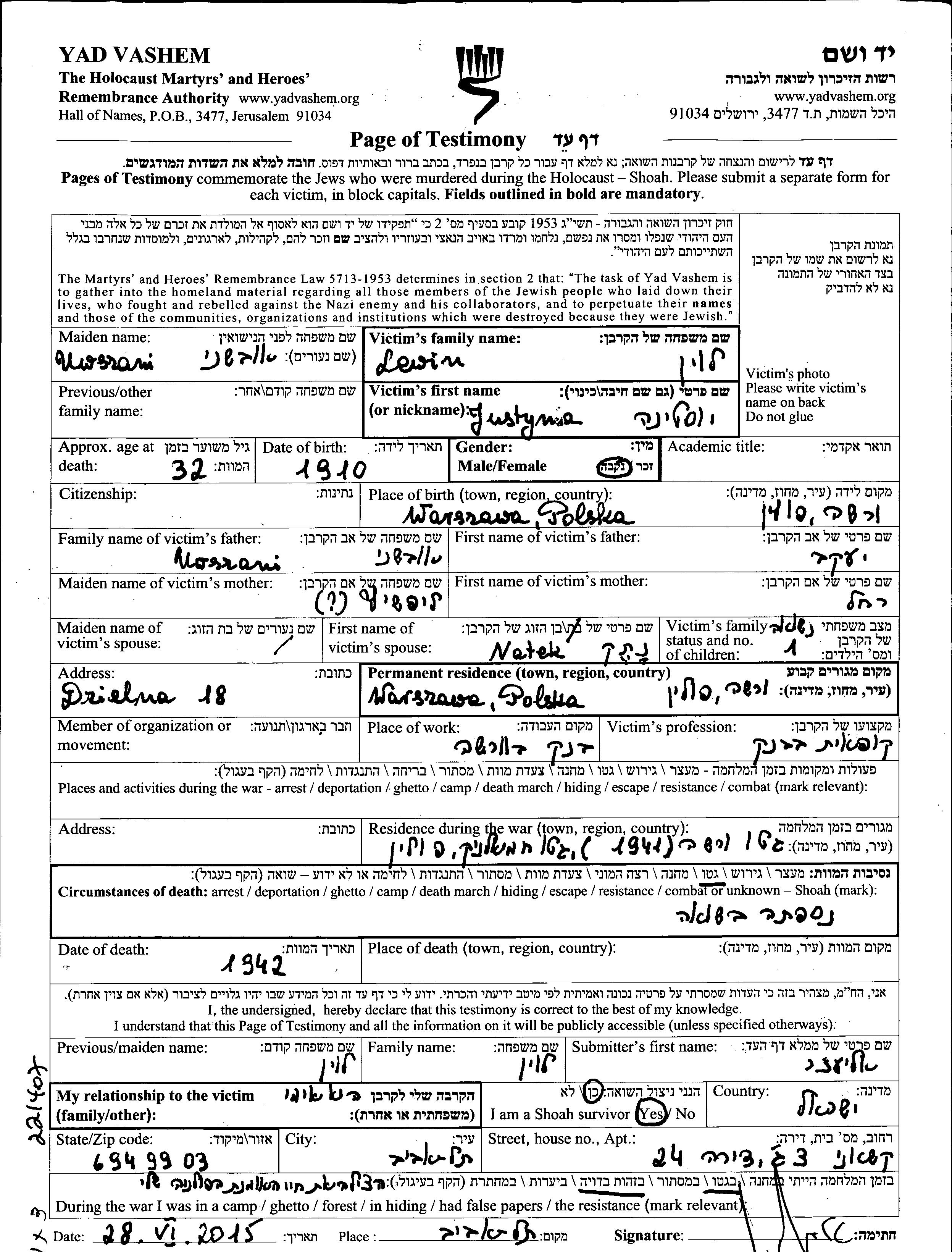 Lewin Justyna 1910 Warszawa, Pologne Feuille de témoignage