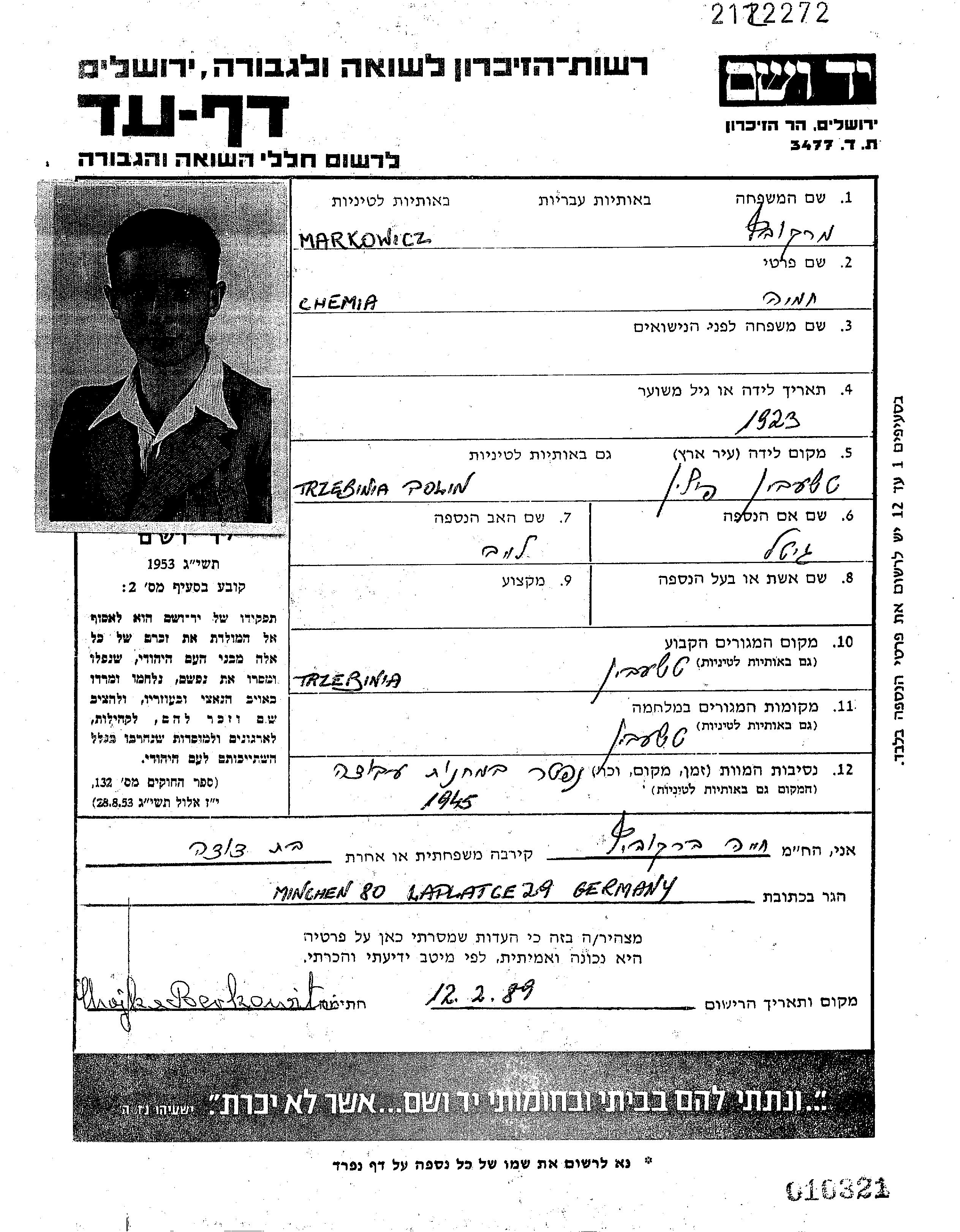 Chemia Markowicz est né à Trzebinia, Pologne en 1923. Avant la seconde guerre mondiale il vivait à Trzebinia, Pologne.