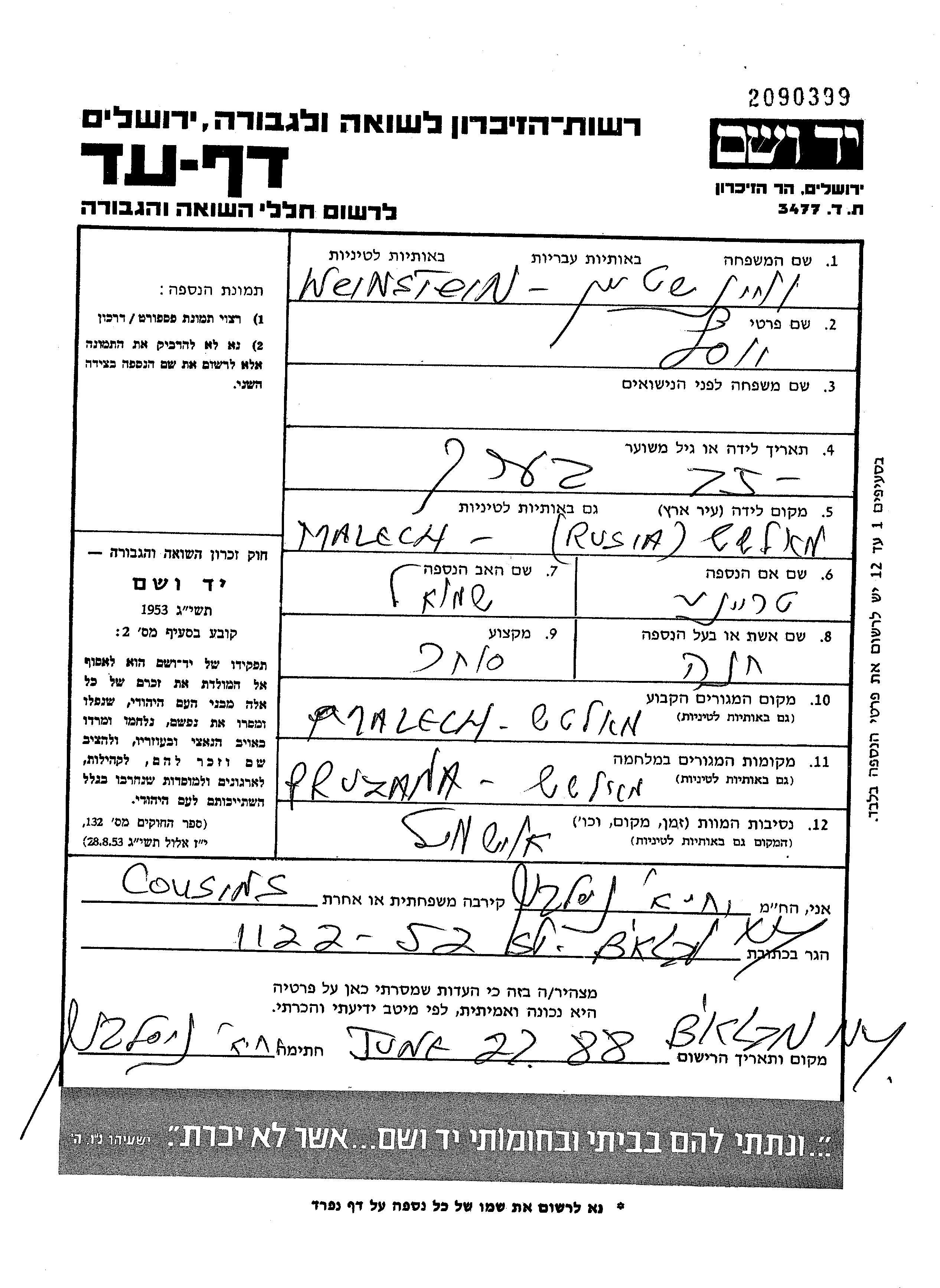 Weinstein Yosef Malecz, Pologne Feuille de témoignage
