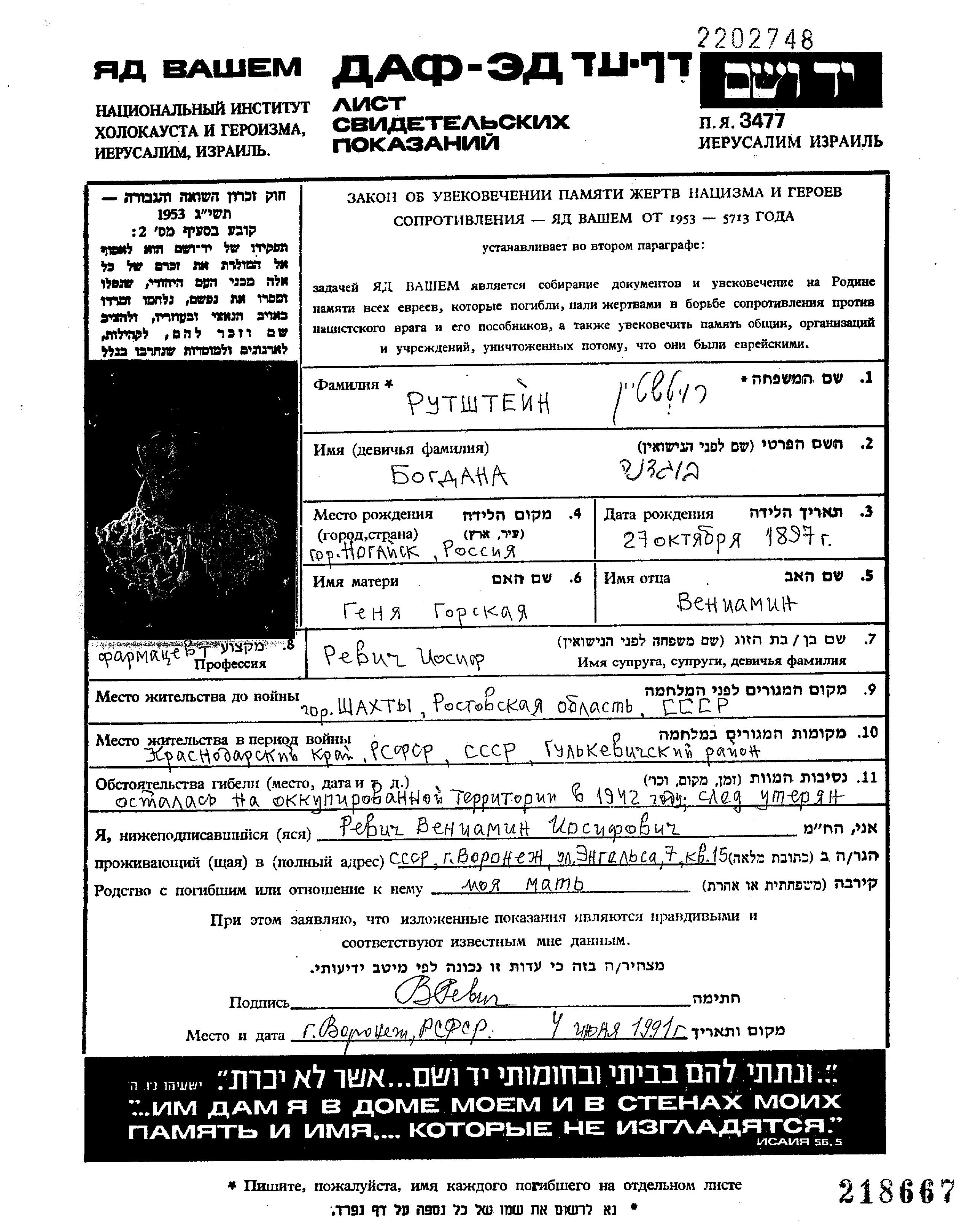 Rutshtein Bogdana 1897 Shakhty, Russie (URSS) Feuille de témoignage