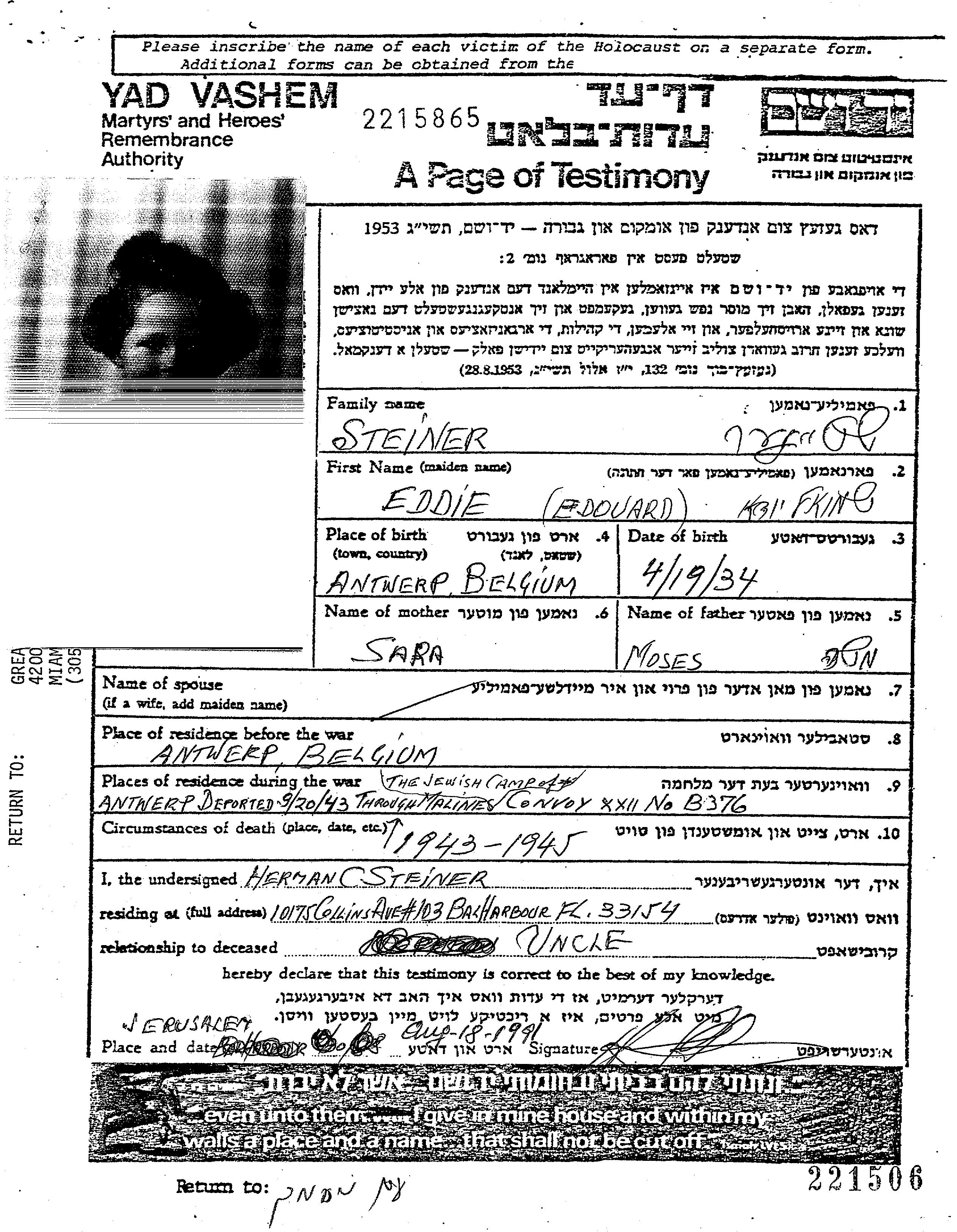 Steiner | Eddie Juda Shmuel | 1934 | Antwerpen, Belgique | Feuille de témoignage |