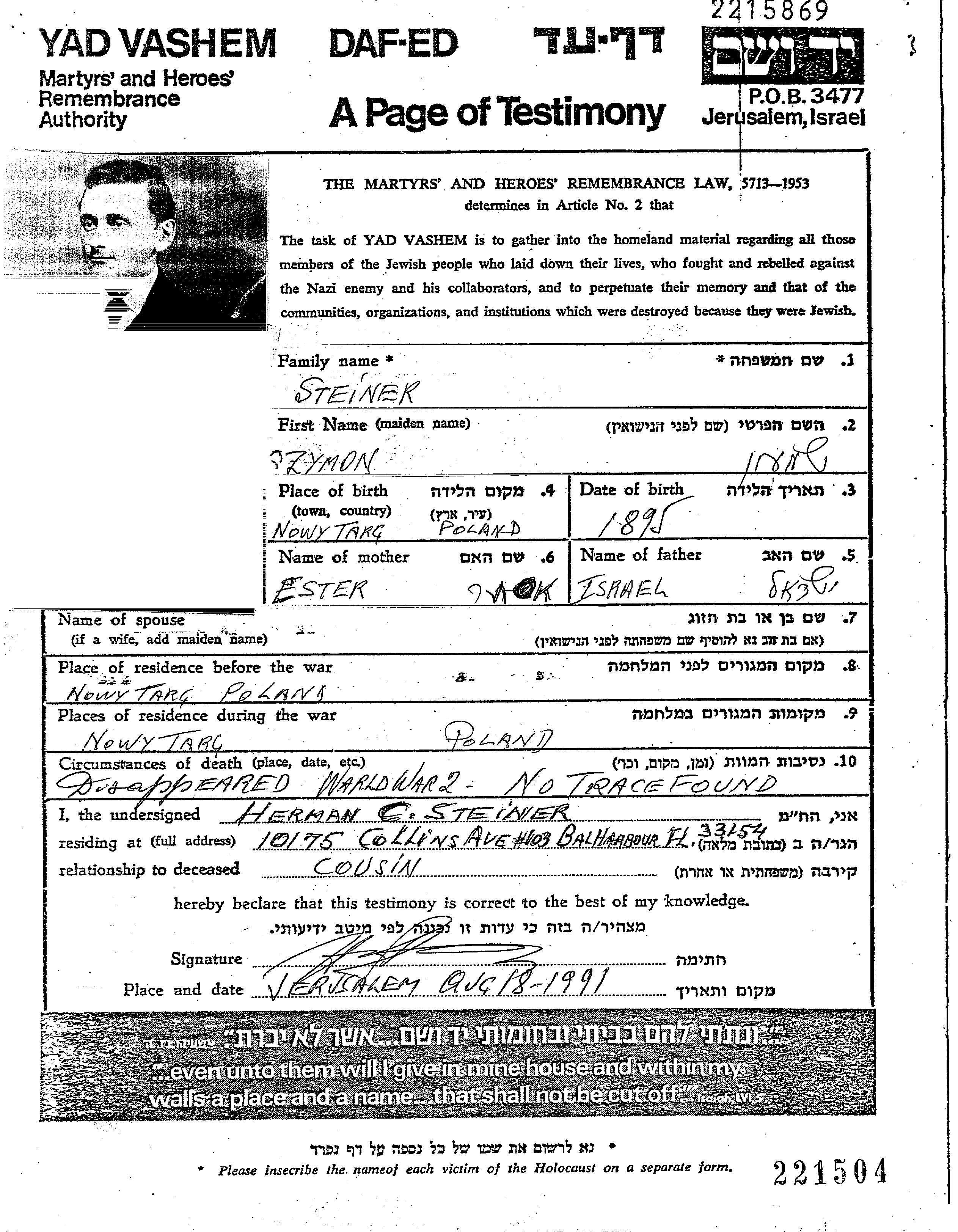 Steiner Szymon Nowy Targ, Pologne Feuille de témoignage