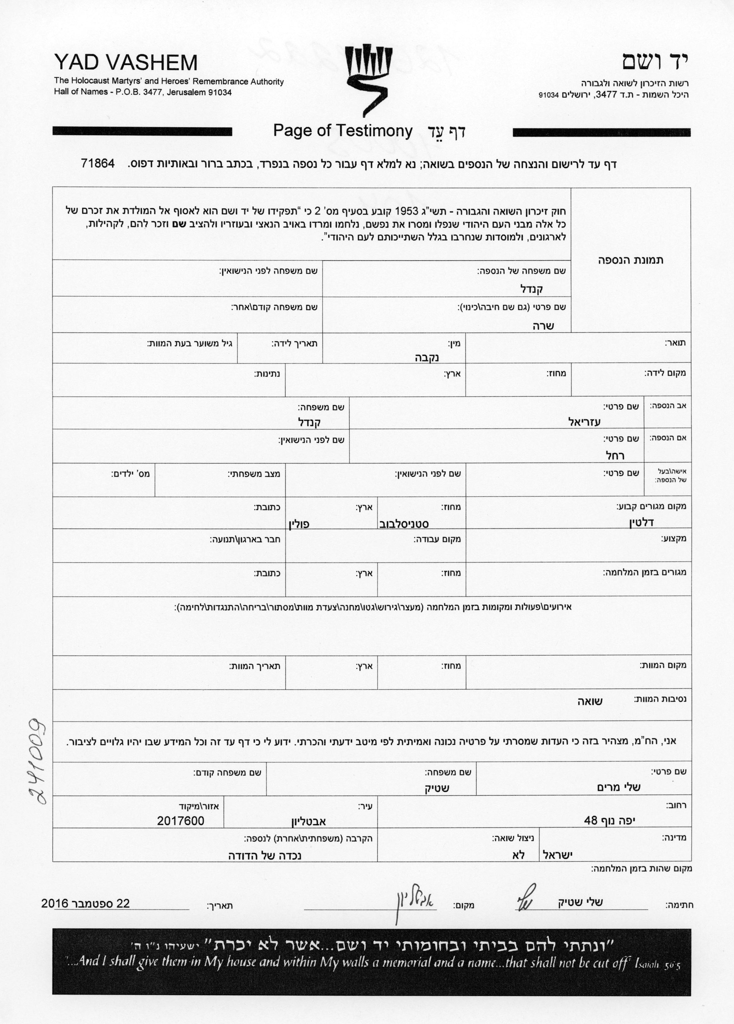 Kandel | Sara | Delatyn, Pologne | Feuille de témoignage (digitale-signée) | |