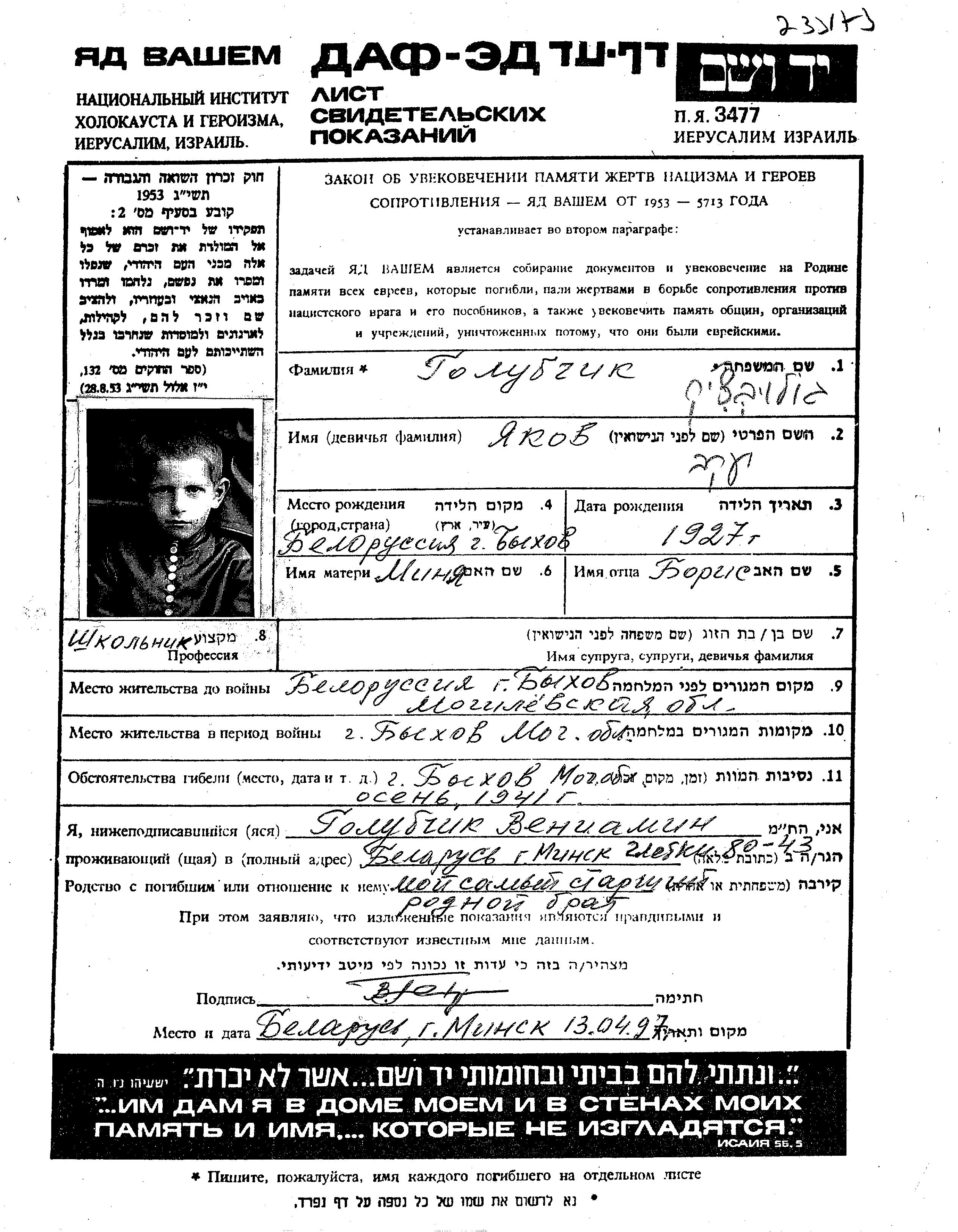 Golubchik Yakov 1927 Bykhov, Bélorussie (URSS) Feuille de témoignage