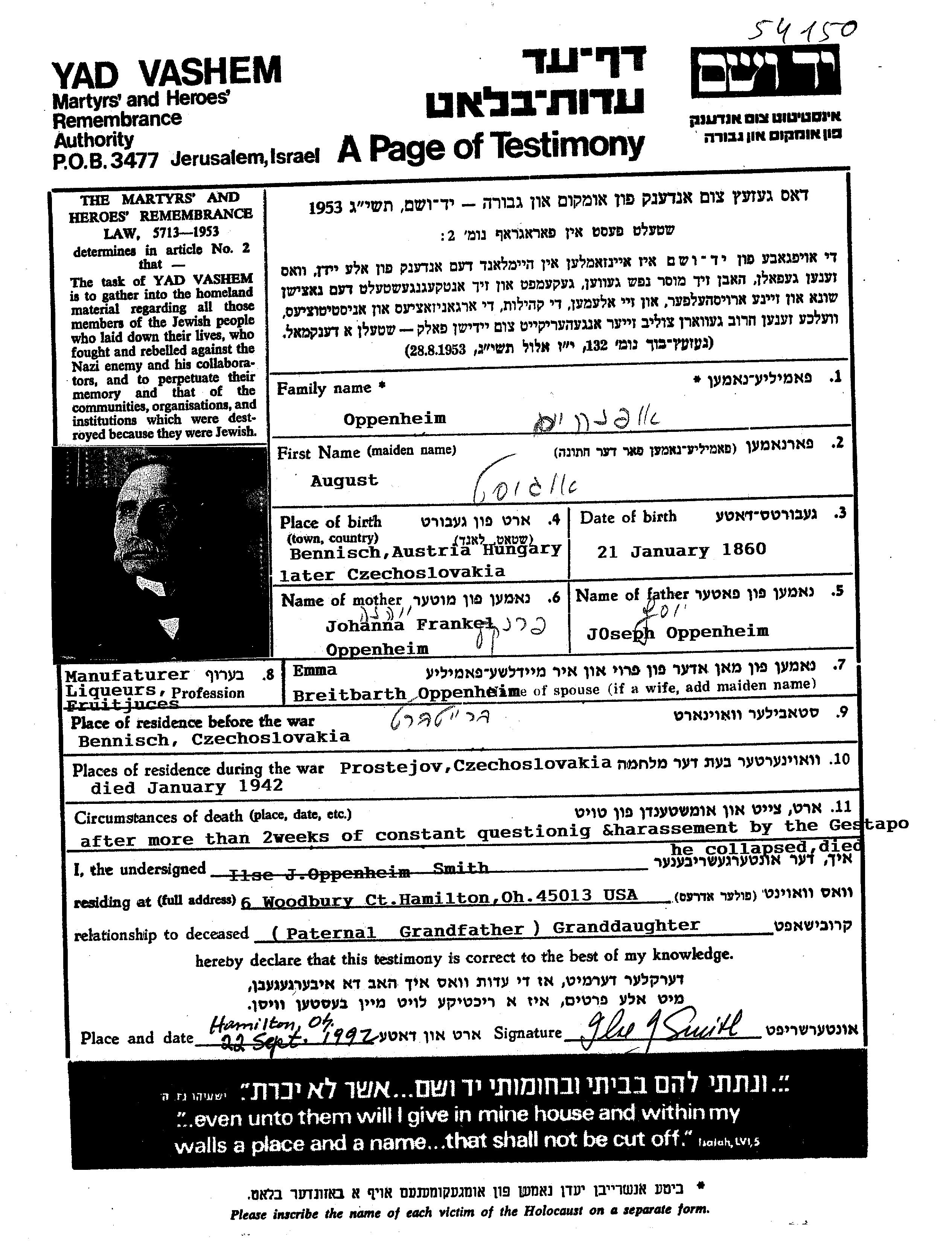 August a été assassiné pendant la Shoah. Lieu de la mort: Prostejov, Tchécoslovaquie en 1942.