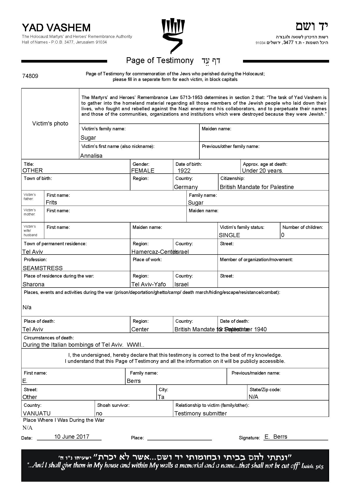| Sugar | Annalisa | 1922 | Tel Aviv, Palestine sous mandat britanique | Feuille de témoignage (digitale) |
