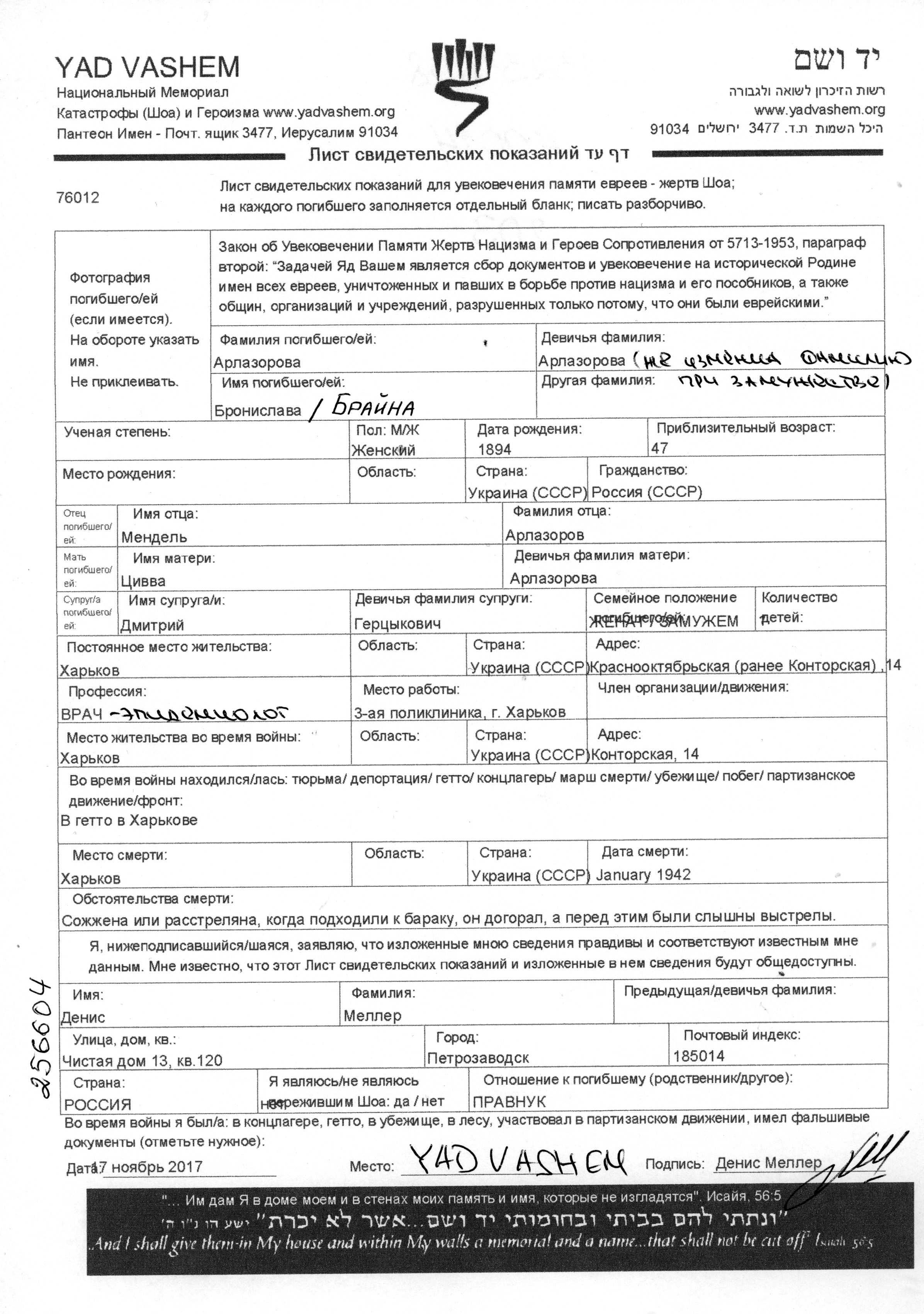 Arlazorova Bronislava 1894 Kharkov, Ukraine (URSS) Feuille de témoignage (digitale-signée)
