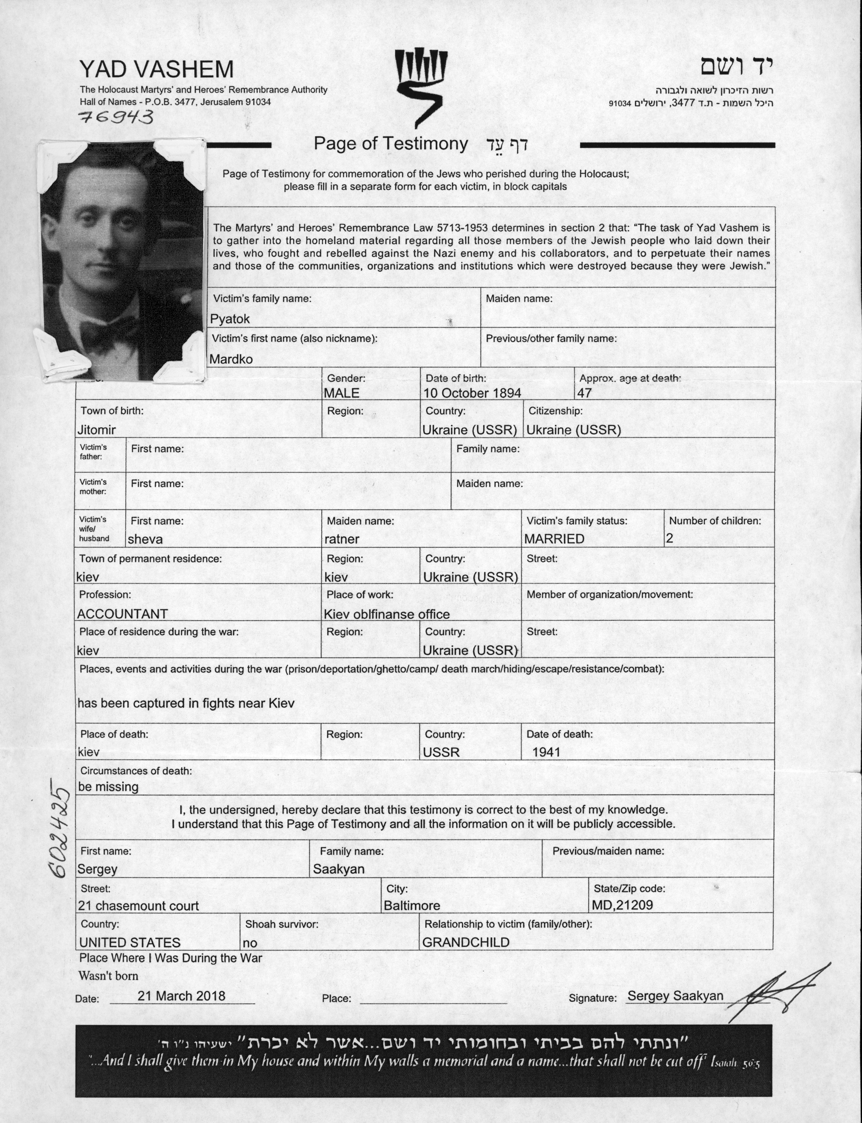 Mardko Pyatok est né à Zhitomir, Ukraine (URSS) en 1894. Il était Comptable. Avant la seconde guerre mondiale il vivait à Kiev, Ukraine (URSS).