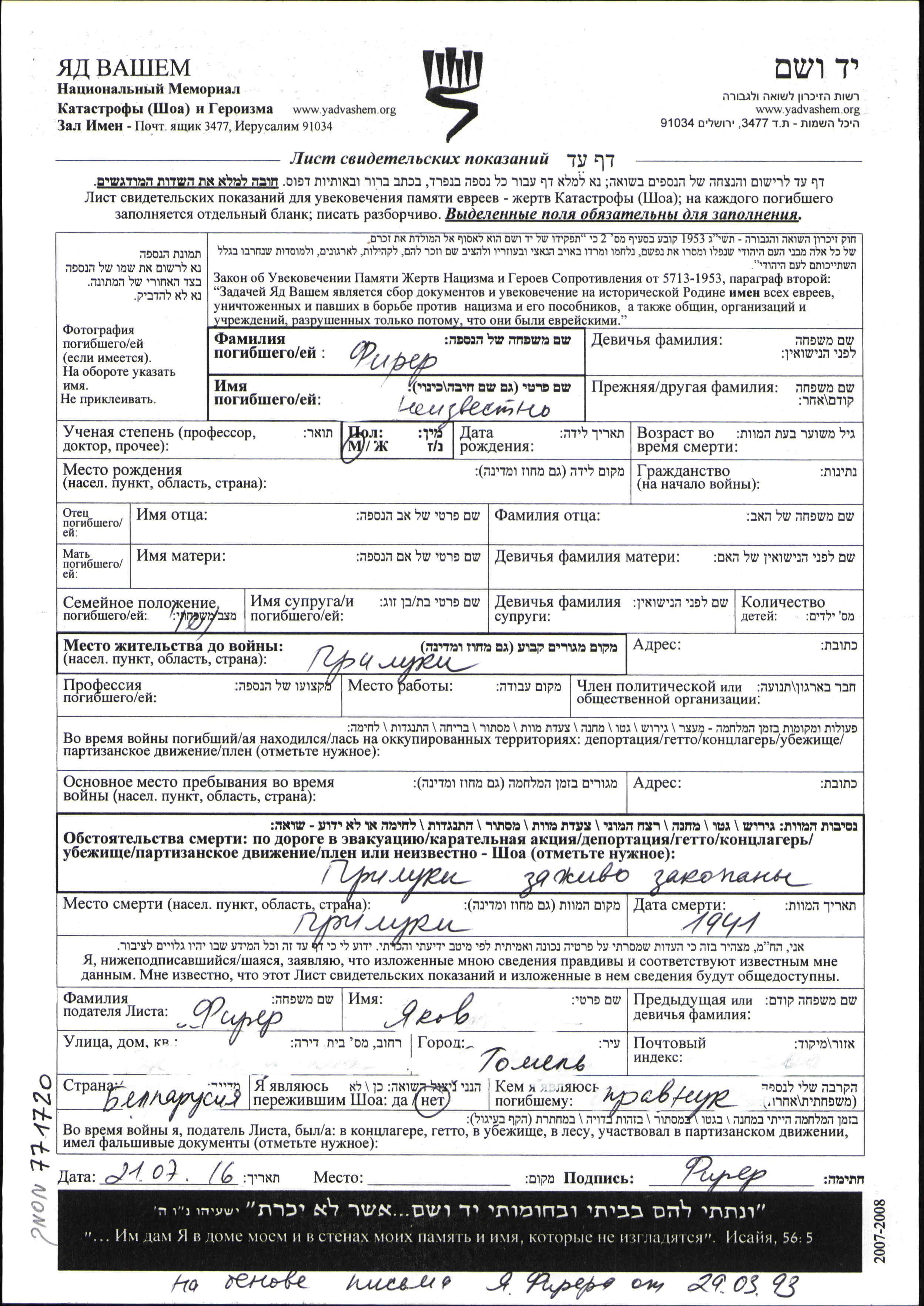 Yad Vashem - Pages of Testimony Names Memorial Collection
