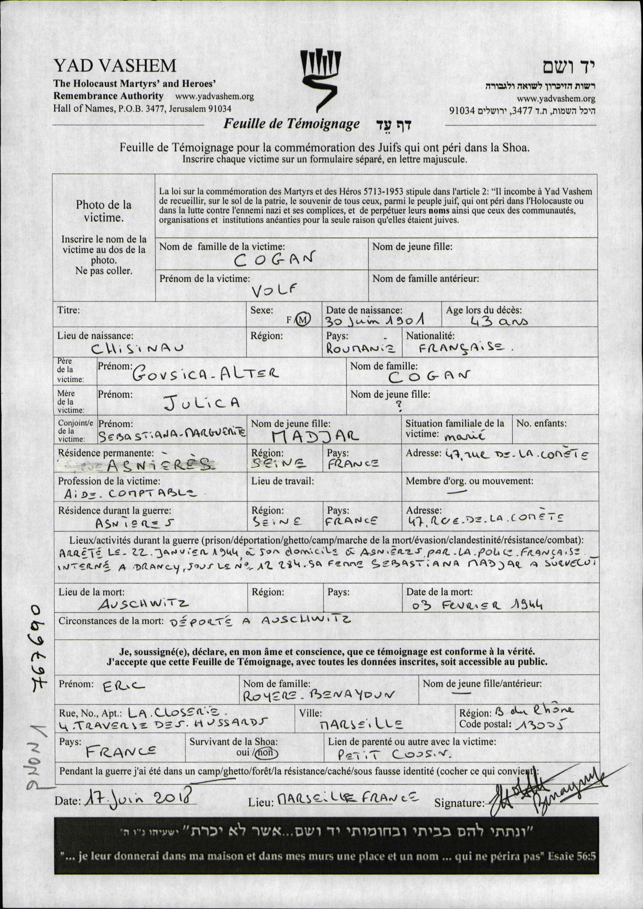 Volf Cogan est né à Chisinau, Roumanie en 1901. Il était Comptable. Avant la seconde guerre mondiale il vivait à Asnieres sur Seine, France.