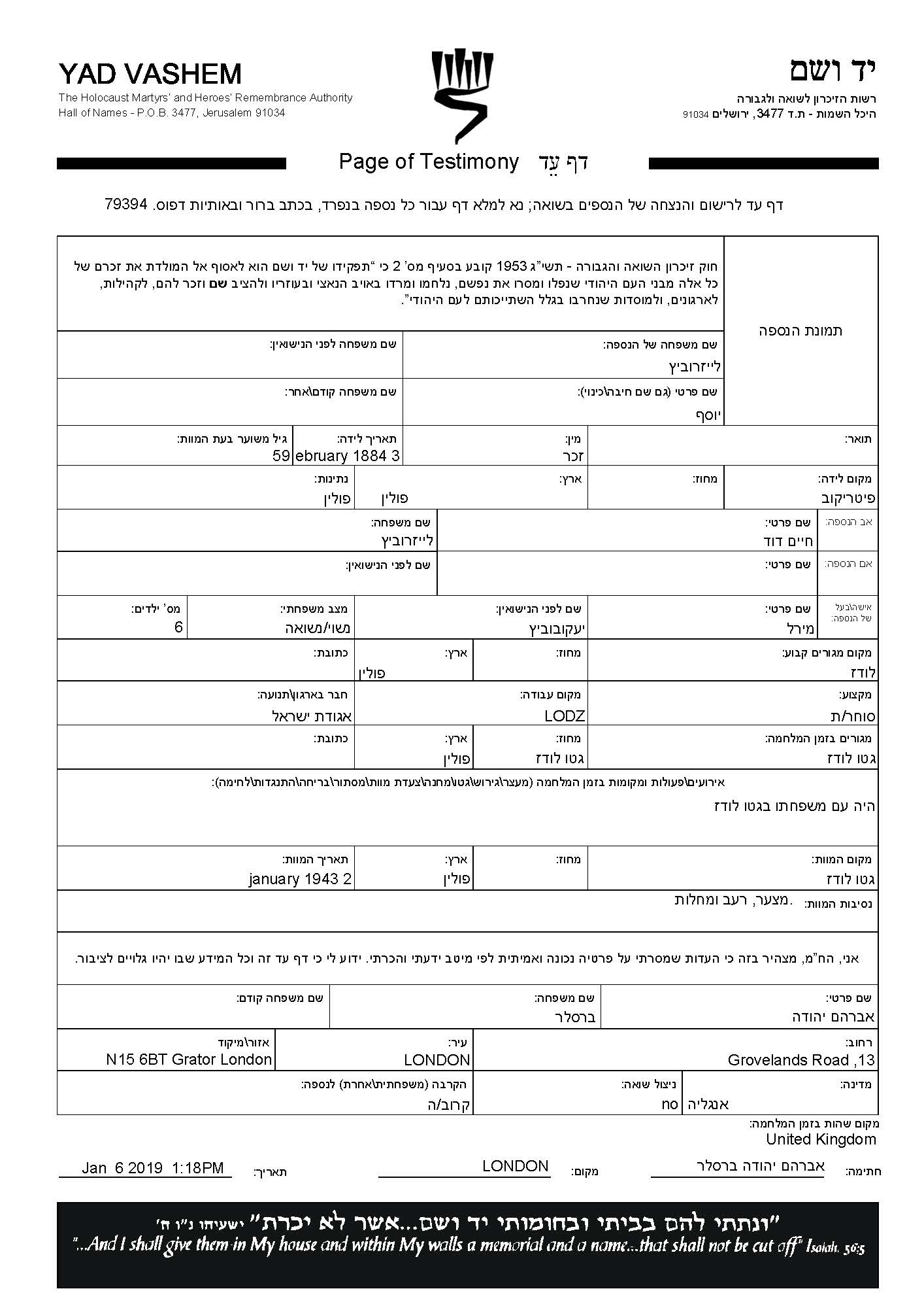 Leizerovitz Yosef 1884 Lodz, Pologne Feuille de témoignage (digitale)