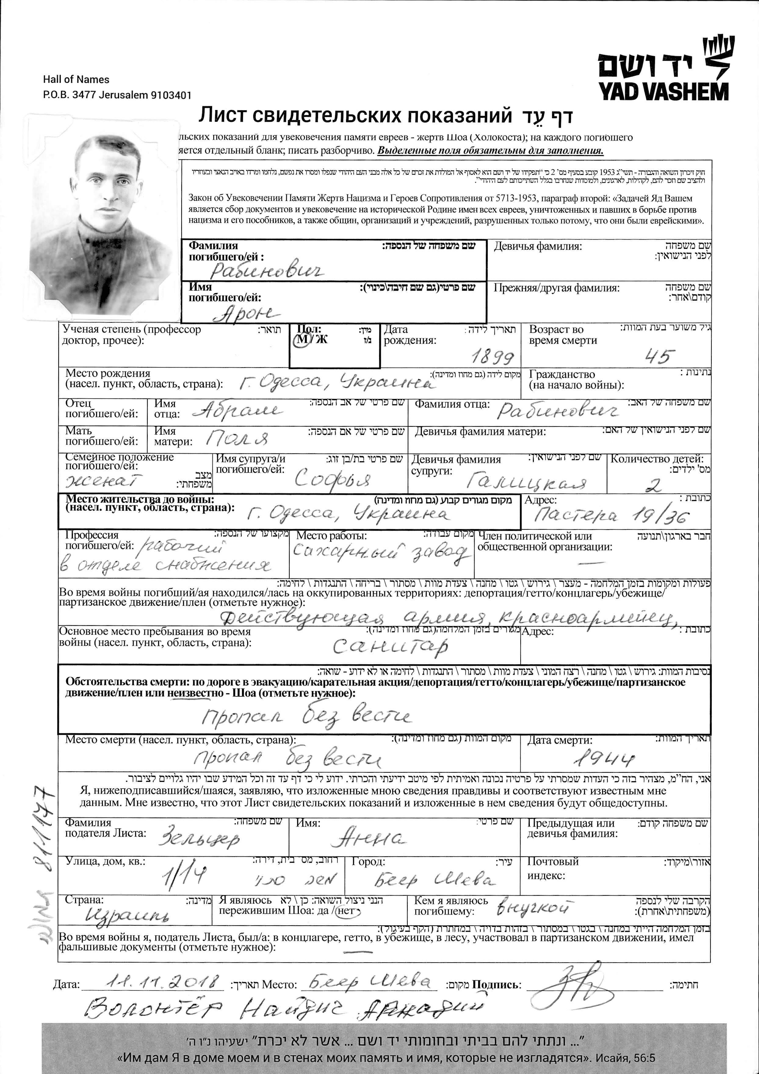 Rabinovich Aron 1899 Odessa, Ukraine (URSS) Feuille de témoignage