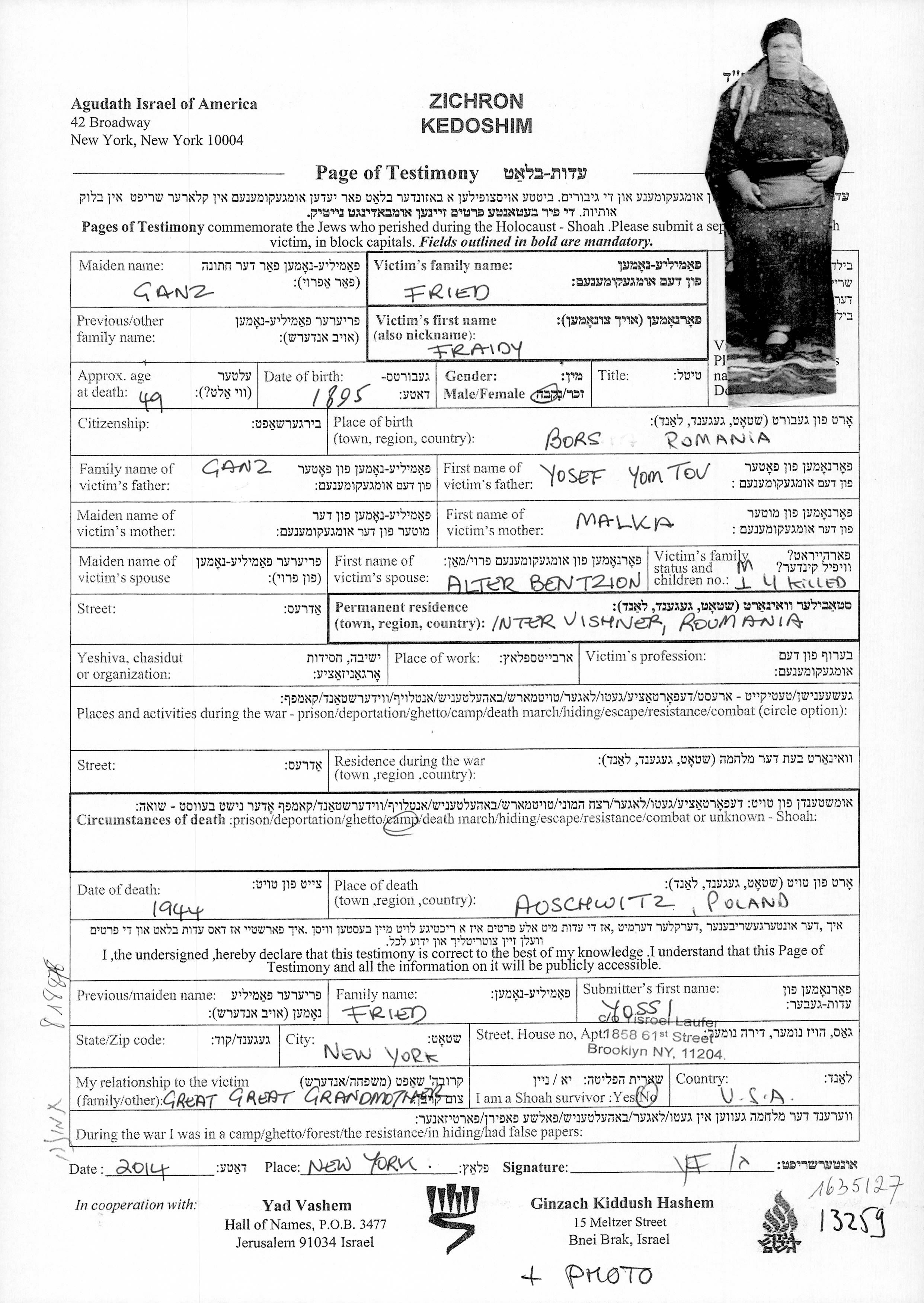 Fraidy Fried née Ganz est née à Bors, Roumanie en 1895. Avant la seconde guerre mondiale elle vivait à Viseul de Mijloc, Roumanie.