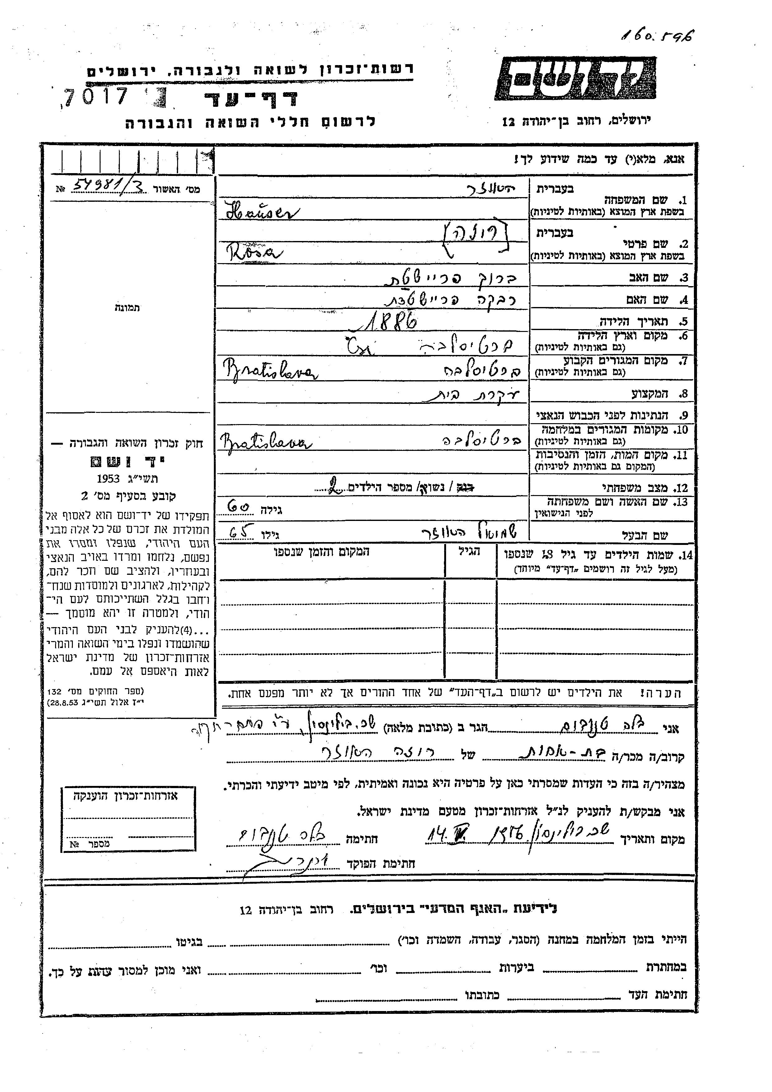 Yad Vashem - Pages of Testimony Names Memorial Collection