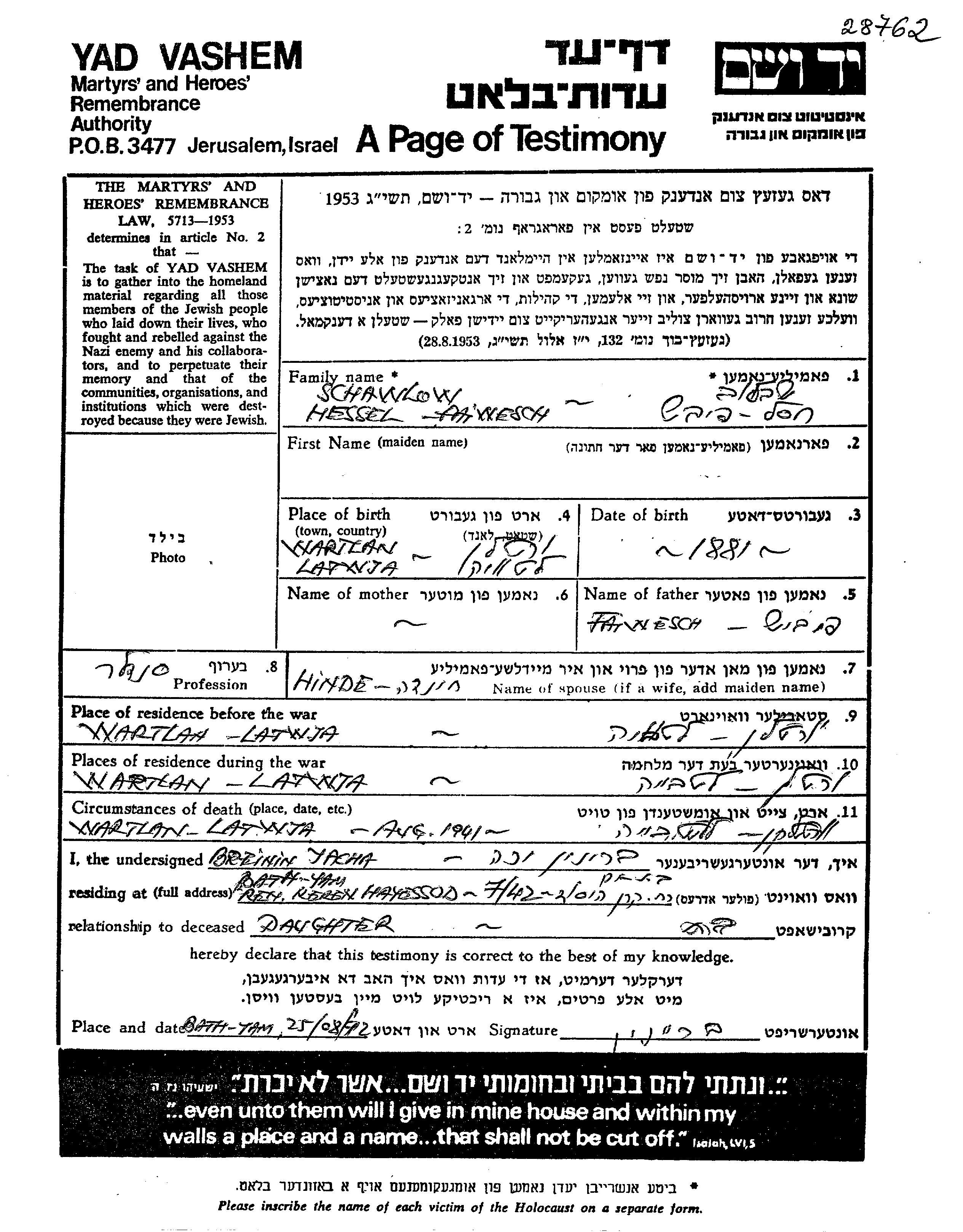 Hessel Khasel Schawlow est né à Varaklani, Lettonie en 1881, fils de Faiwesch. Il était Cordonnier et Mariée à Hinde. Avant la seconde guerre mondiale il vivait à Varaklani, Lettonie. Au cours de la guerre, il était à Varaklani, Lettonie.