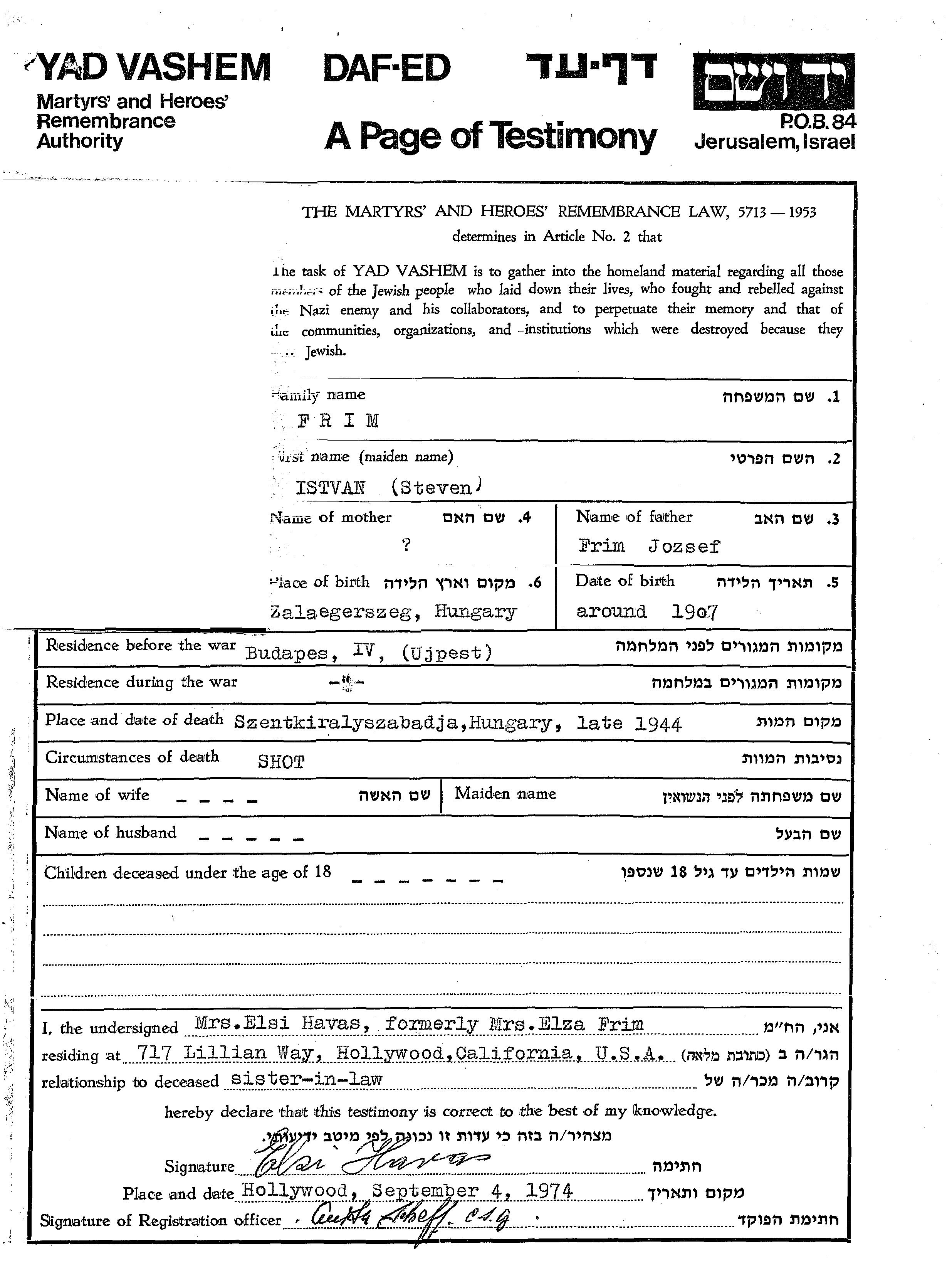 Ishtvan Steven Frim est né à Zalaegerszeg, Hongrie en 1907. Avant la seconde guerre mondiale il vivait à Budapest, Hongrie.