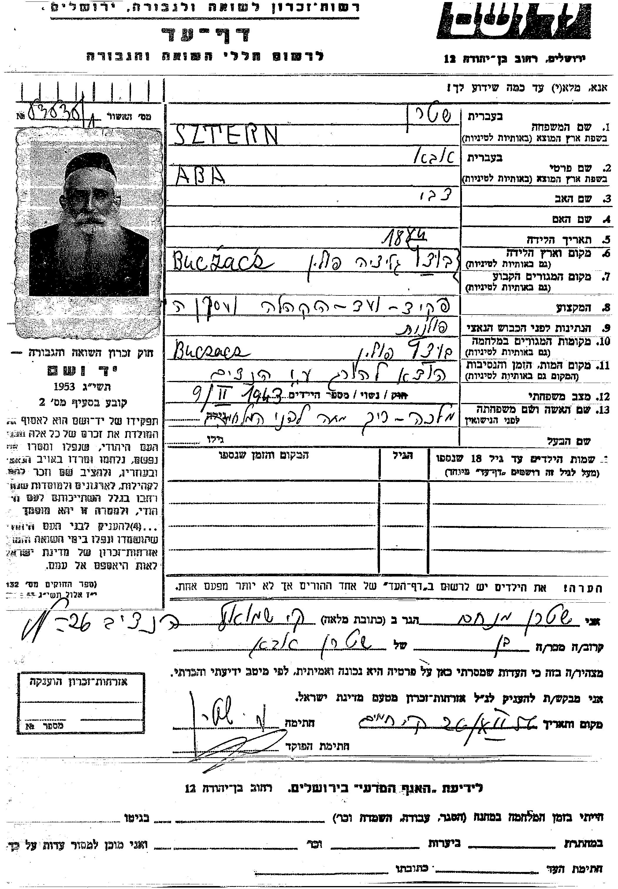 Aba Sztern est né à Buczacz, Pologne en 1884. Il était Clerk in community council. Avant la seconde guerre mondiale il vivait à Buczacz, Pologne.