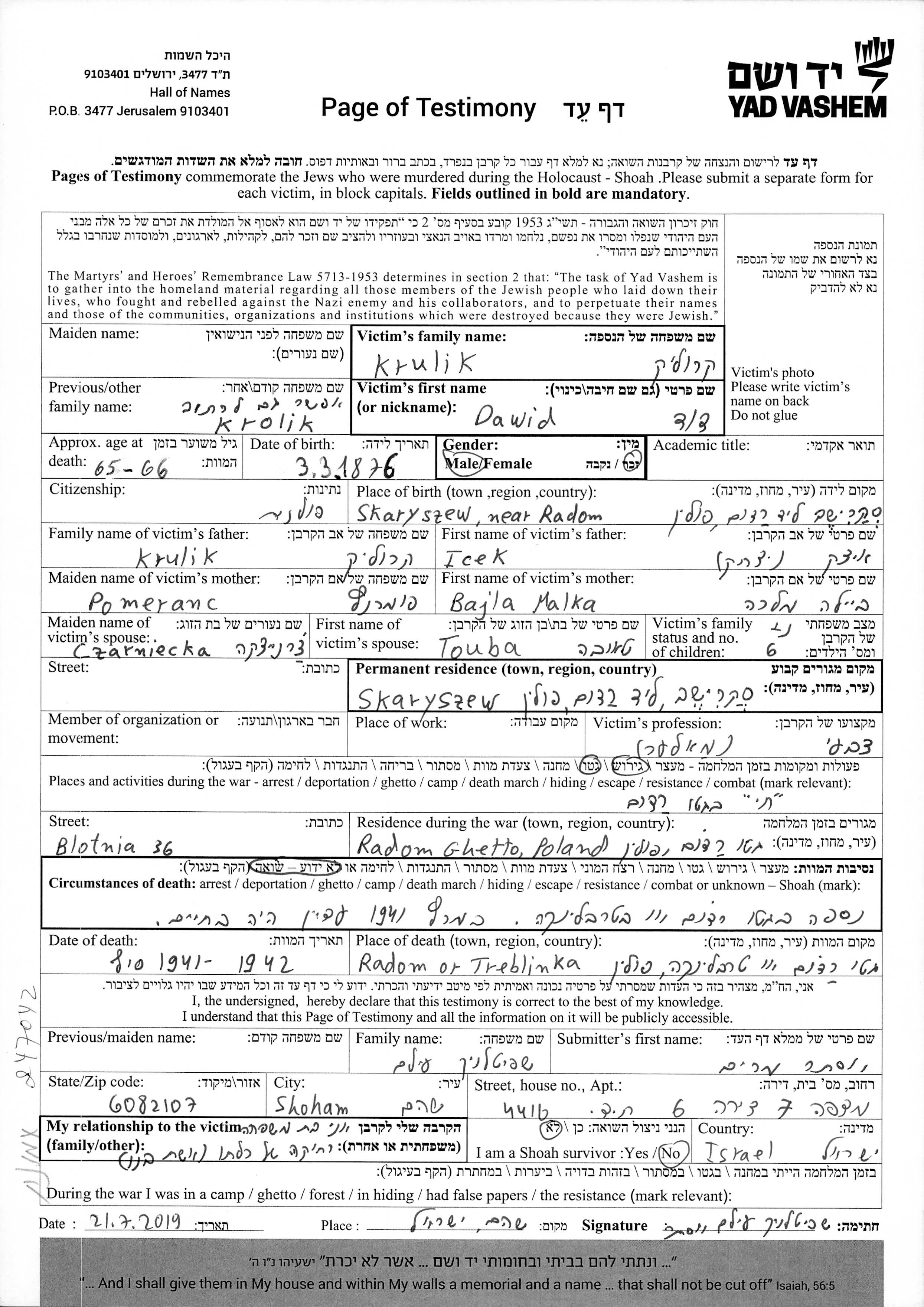 Dawid Krulik est né à Skaryszew, Pologne en 1876. Il était Peintre en bâtiment. Avant la seconde guerre mondiale il vivait à Skaryszew, Pologne.