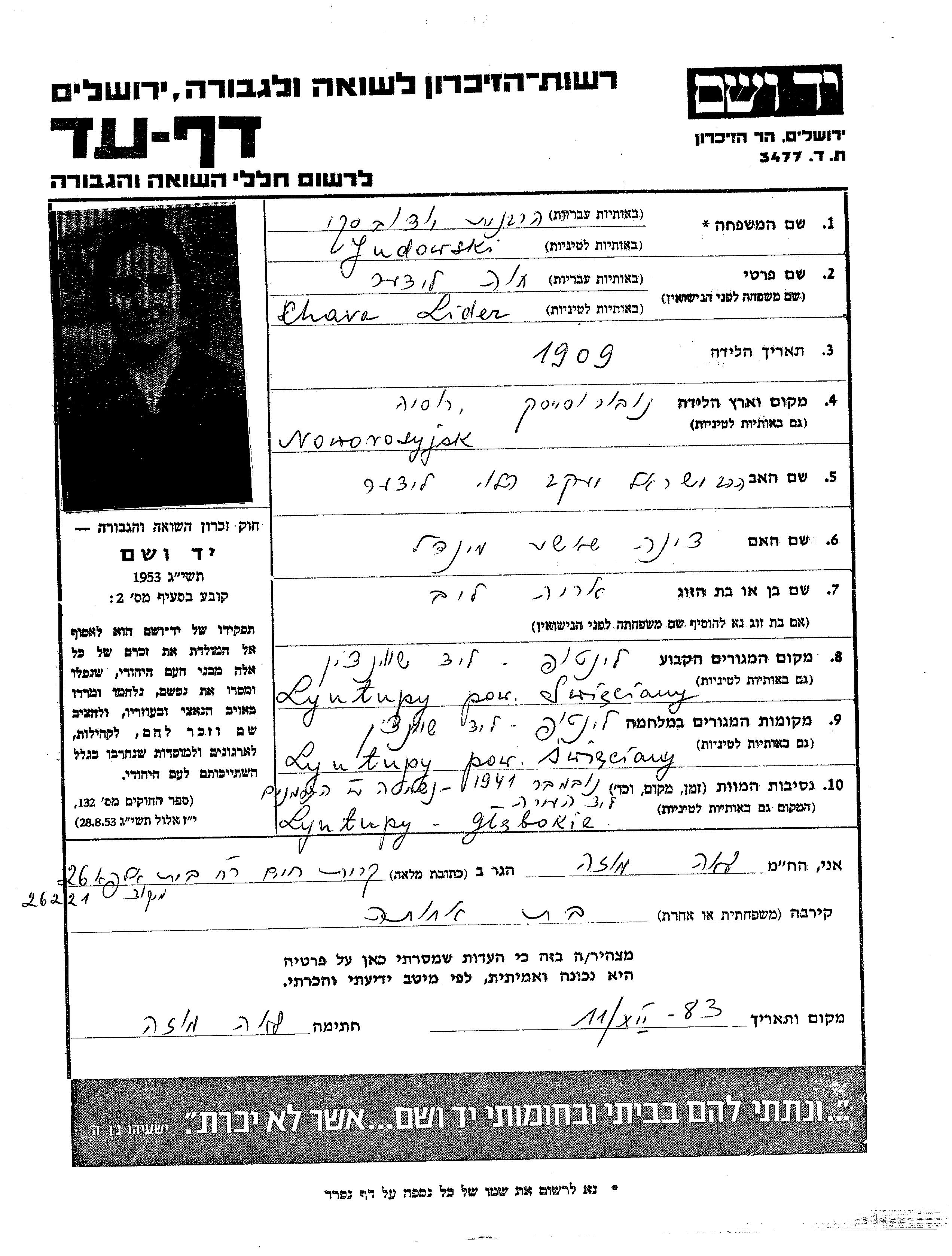 | Judowski | Chava | 1909 | Lyntupy, Pologne | Feuille de témoignage |