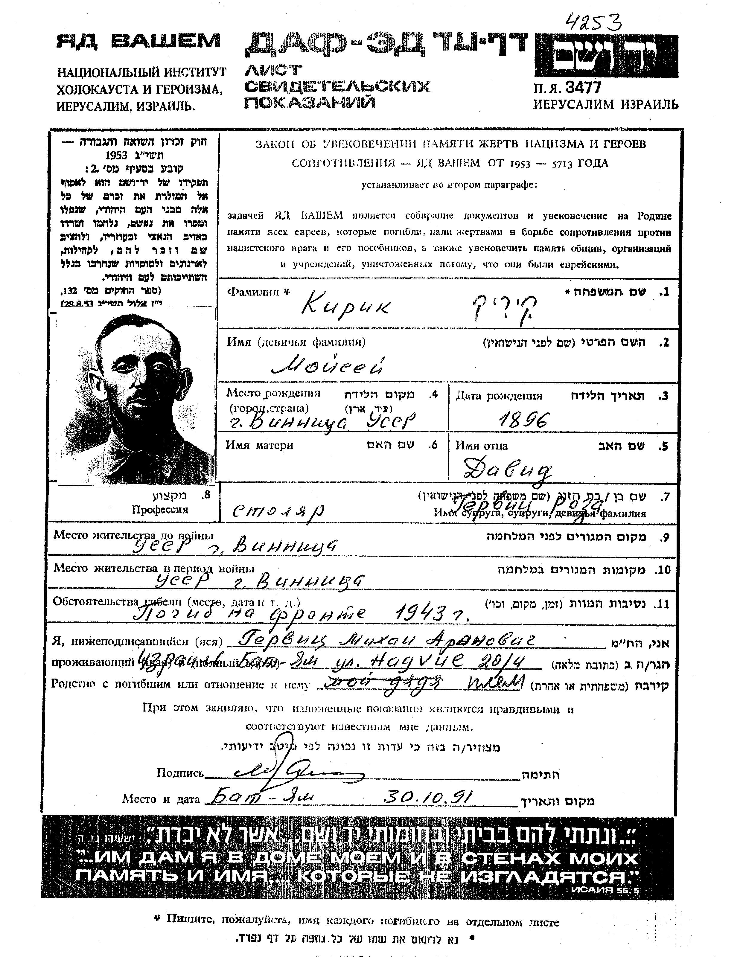 Kirik Moisey 1896 Vinnitsa, Ukraine (URSS) Feuille de témoignage
