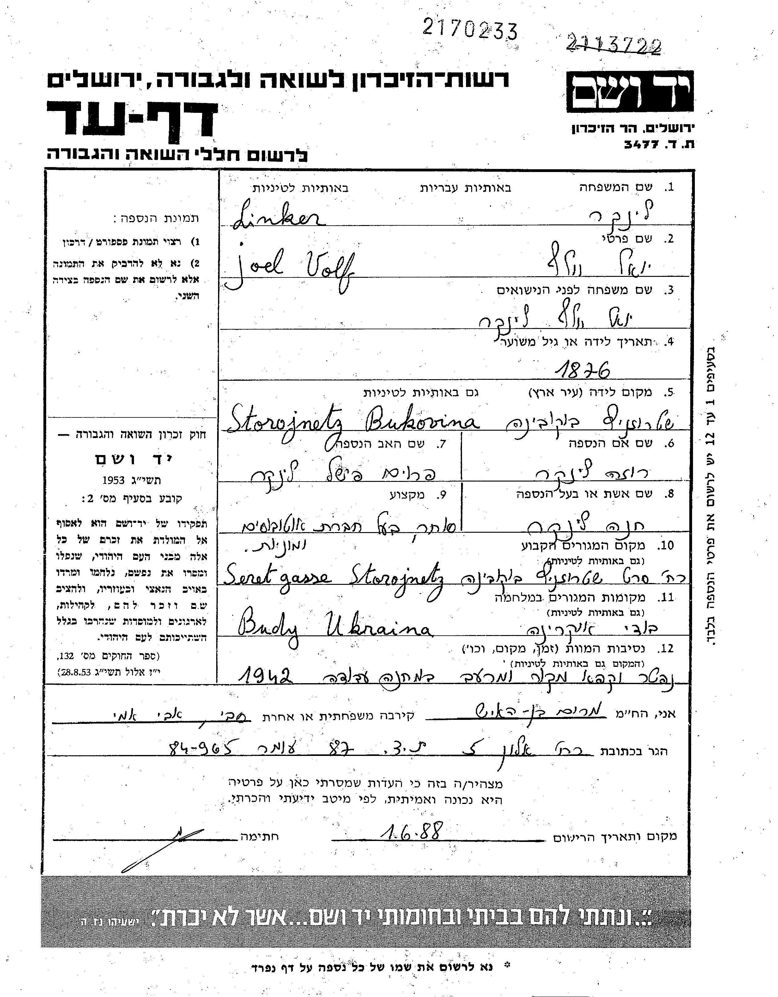 | Linker | Joel Volf | 1876 | Storojinet, Roumanie | Feuille de témoignage |
