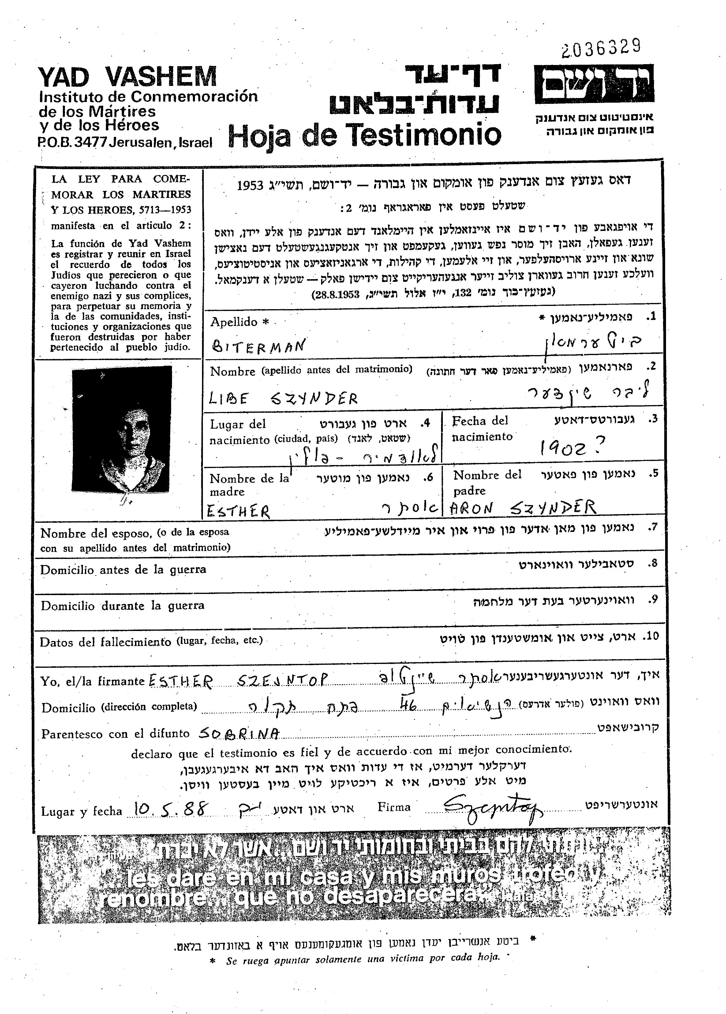 Liba Biterman née Szynder est née à Wlodzimierz, Pologne en 1902. Avant la seconde guerre mondiale elle vivait à Wlodzimierz, Pologne.