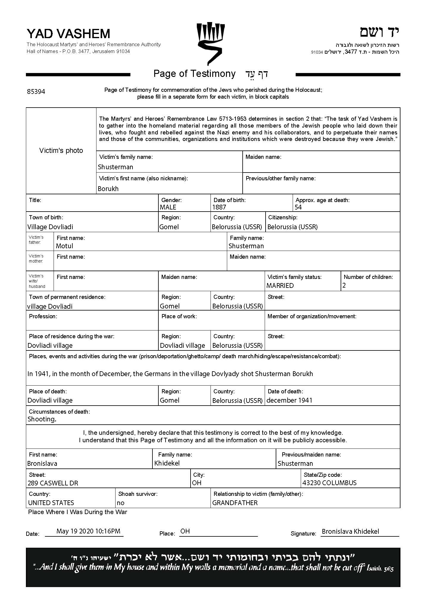 Shusterman Borukh 1887 Dovlyady, Bélorussie (URSS) Feuille de témoignage (digitale)