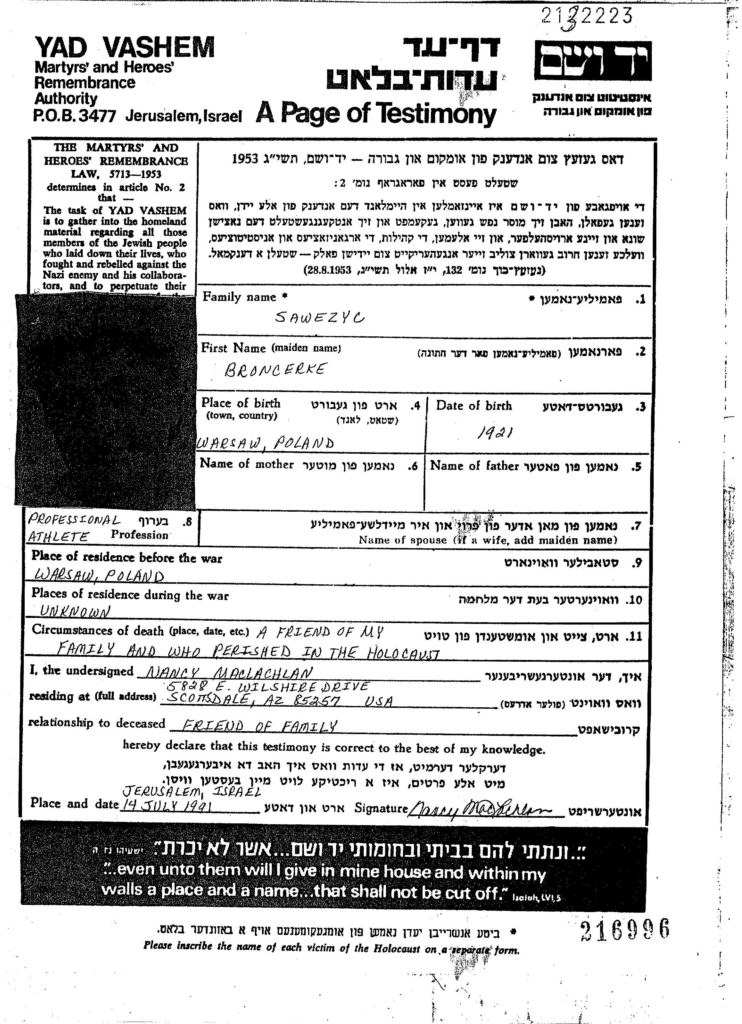 Broncerke Sawezyc est née à Warszawa, Pologne. Elle était Athléte. Avant la seconde guerre mondiale elle vivait à Warszawa, Pologne.
