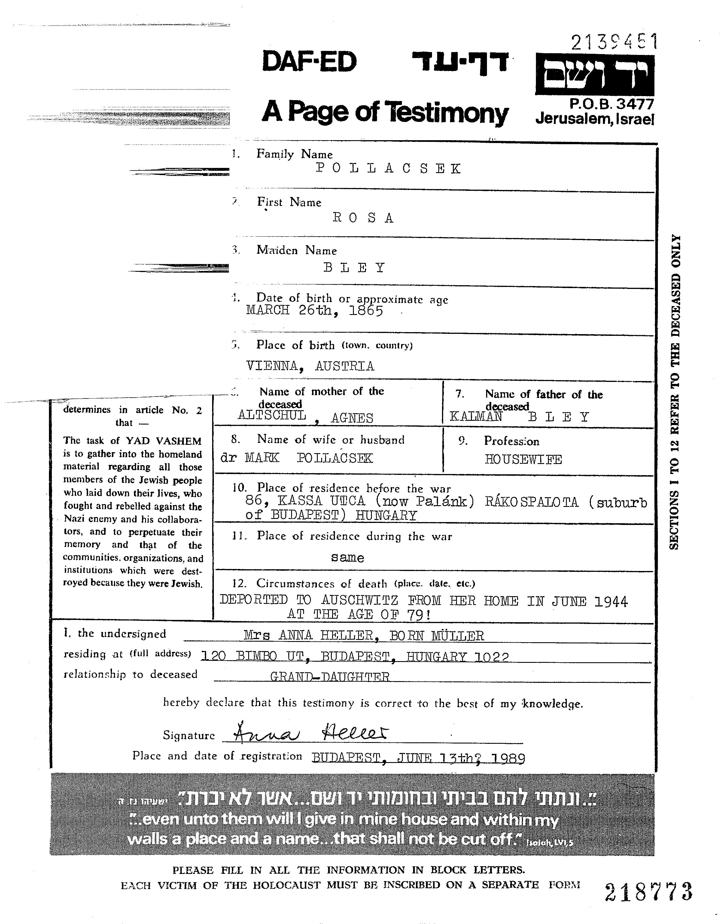 Rosa Pollacsek née Bley est née à Wien, Autriche en 1865. Elle était Femme au foyer. Avant la seconde guerre mondiale elle vivait à Rakospalota, Hongrie.