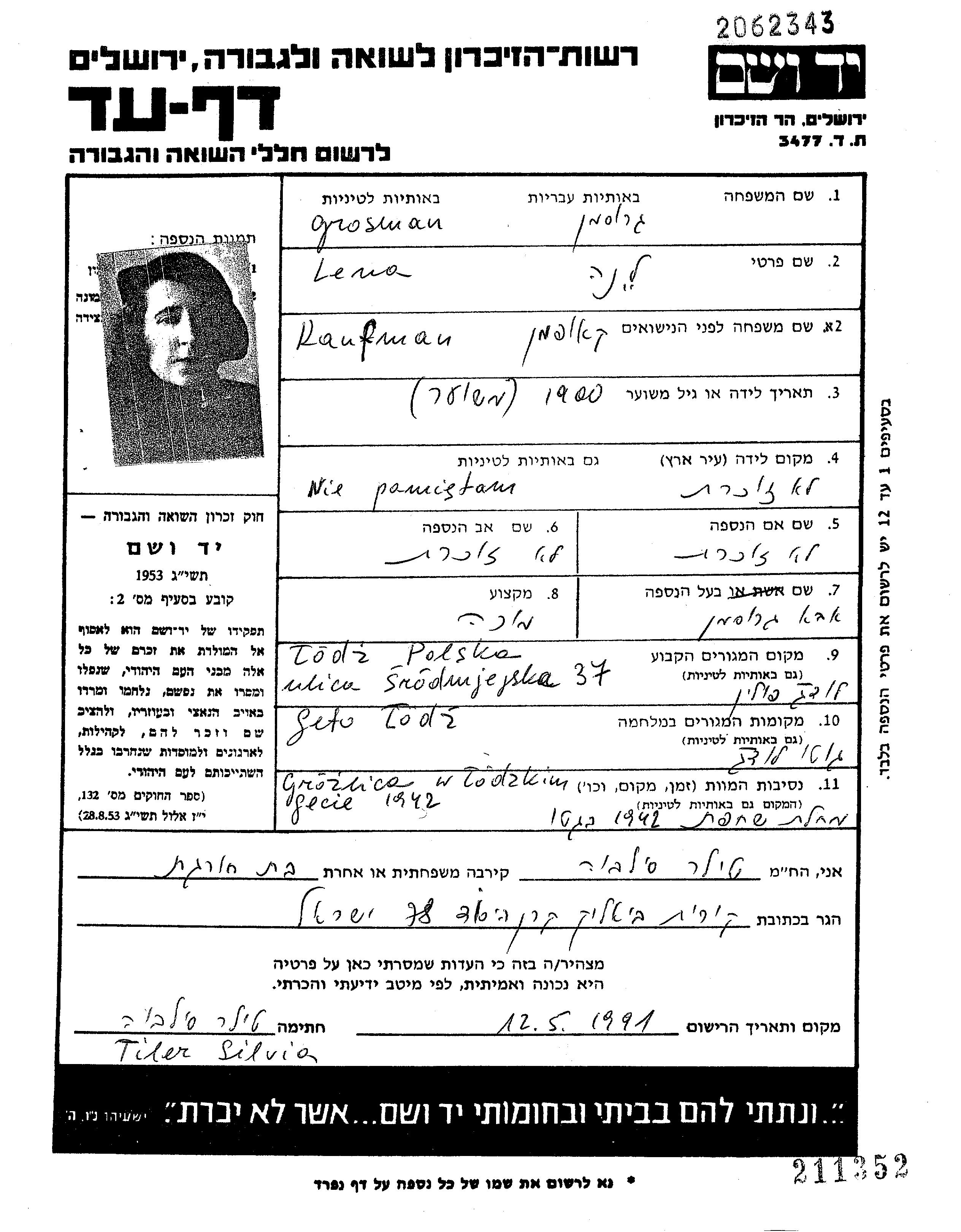 Grosman Lena 1900 Lodz, Pologne Feuille de témoignage