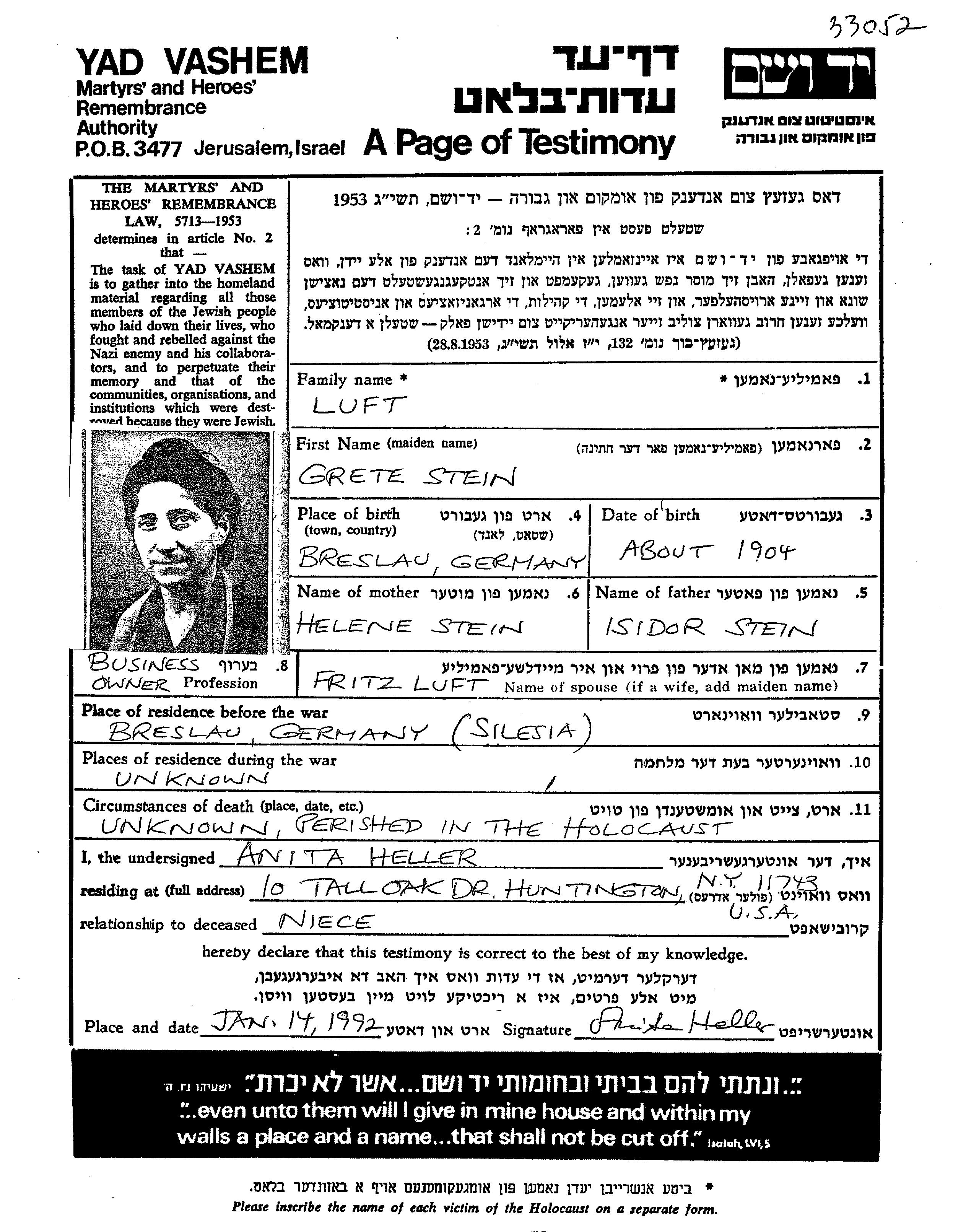 Grete Luft née Stein est née à Breslau, Allemagne en 1904. Avant la seconde guerre mondiale elle vivait à Breslau, Allemagne.