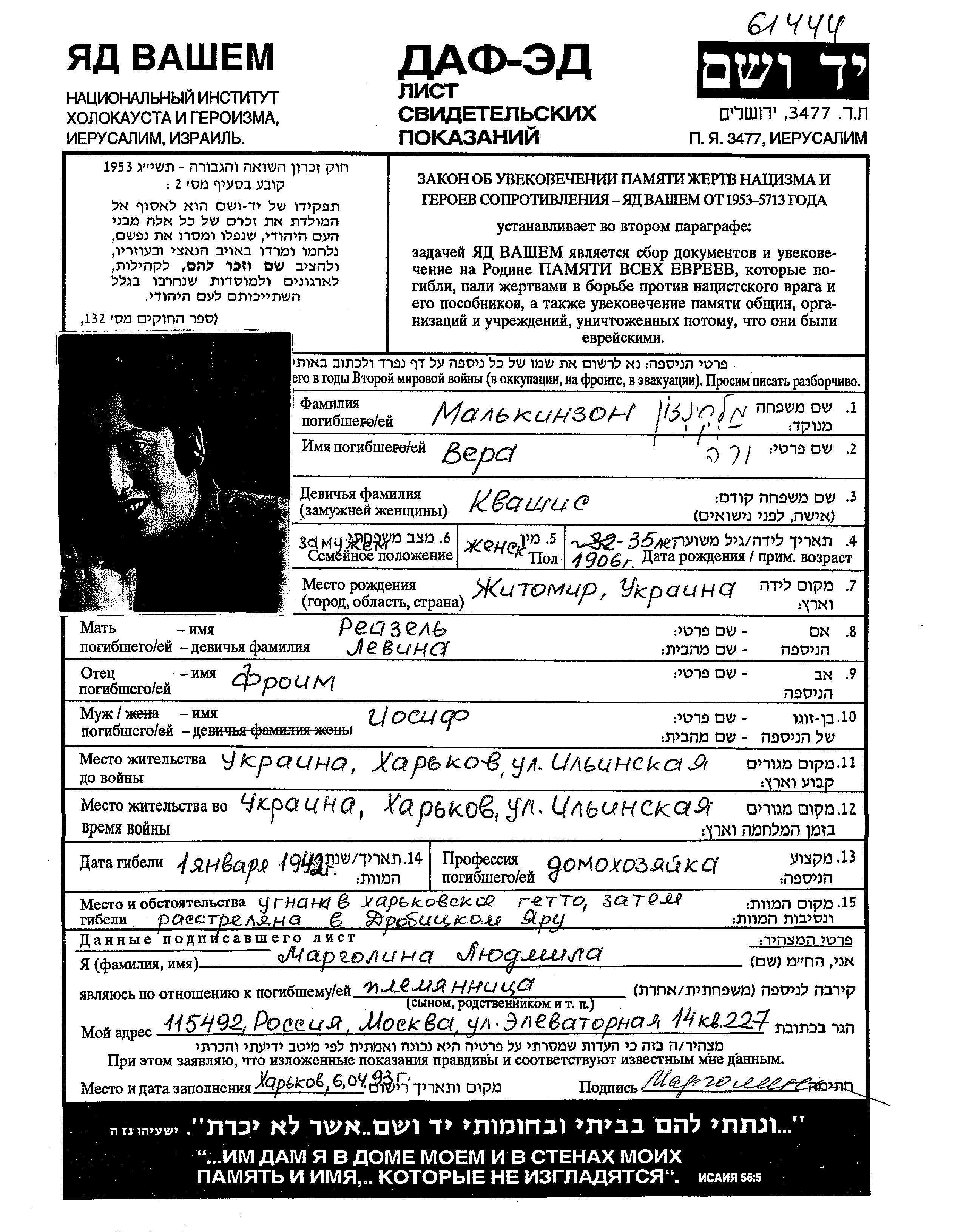 Vera Malkinzon née Kvashis est née à Zhitomir, Ukraine (URSS). Elle était Femme au foyer. Avant la seconde guerre mondiale elle vivait à Kharkov, Ukraine (URSS). Vera a été assassinée pendant la Shoah. Lieu de la mort: Drobitskiy Yar, Lieu de massacre en 01/12/1942.