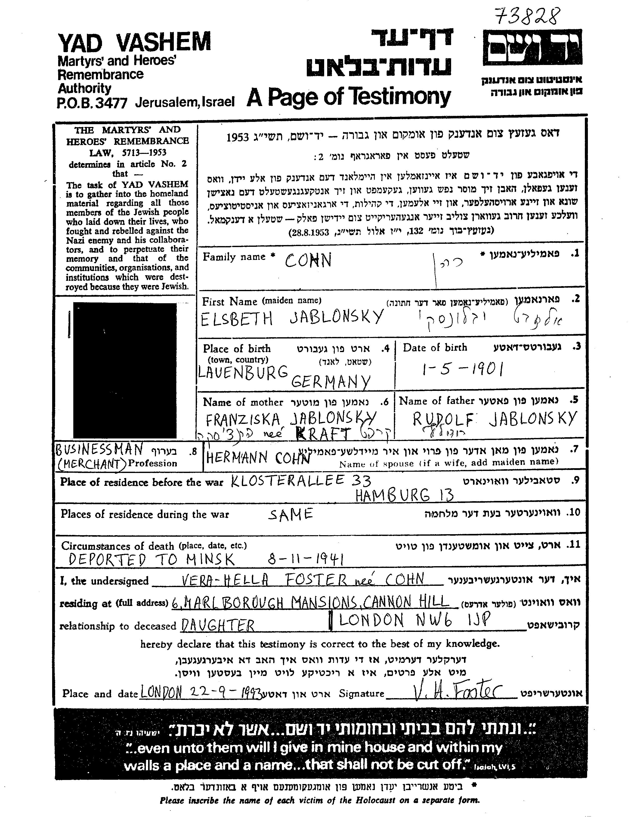 Elsbeth Cohn née Jablonsky est née à Allemagne en 1901. Elle était מזכירה בכירה. Avant la seconde guerre mondiale elle vivait à Hamburg, Allemagne.
