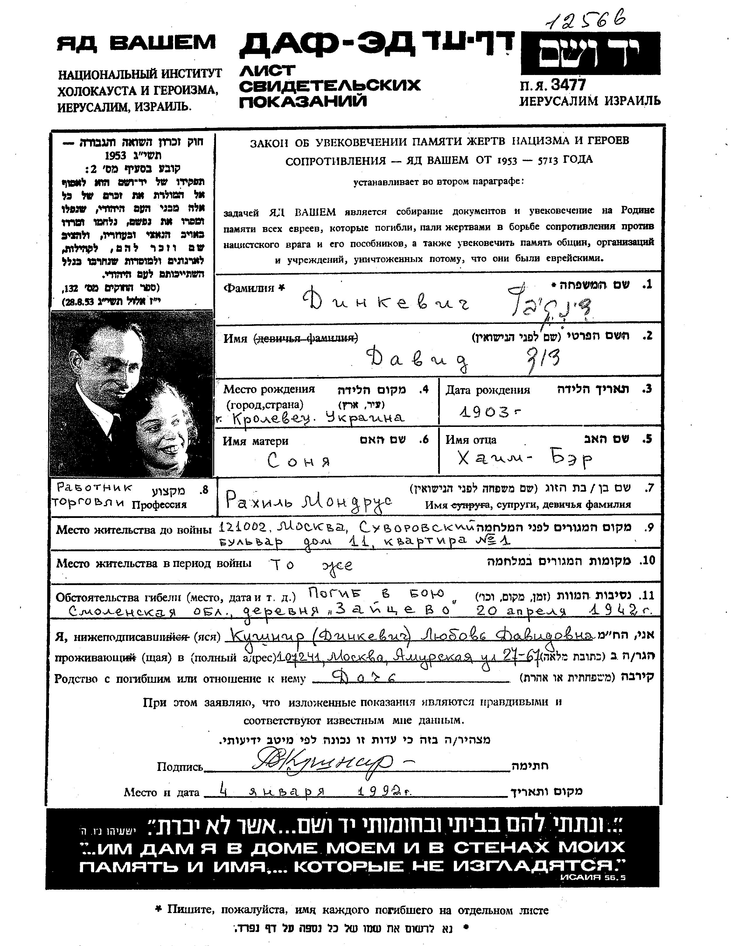 Dinkevich David 1903 Moskva, Russie (URSS) Feuille de témoignage