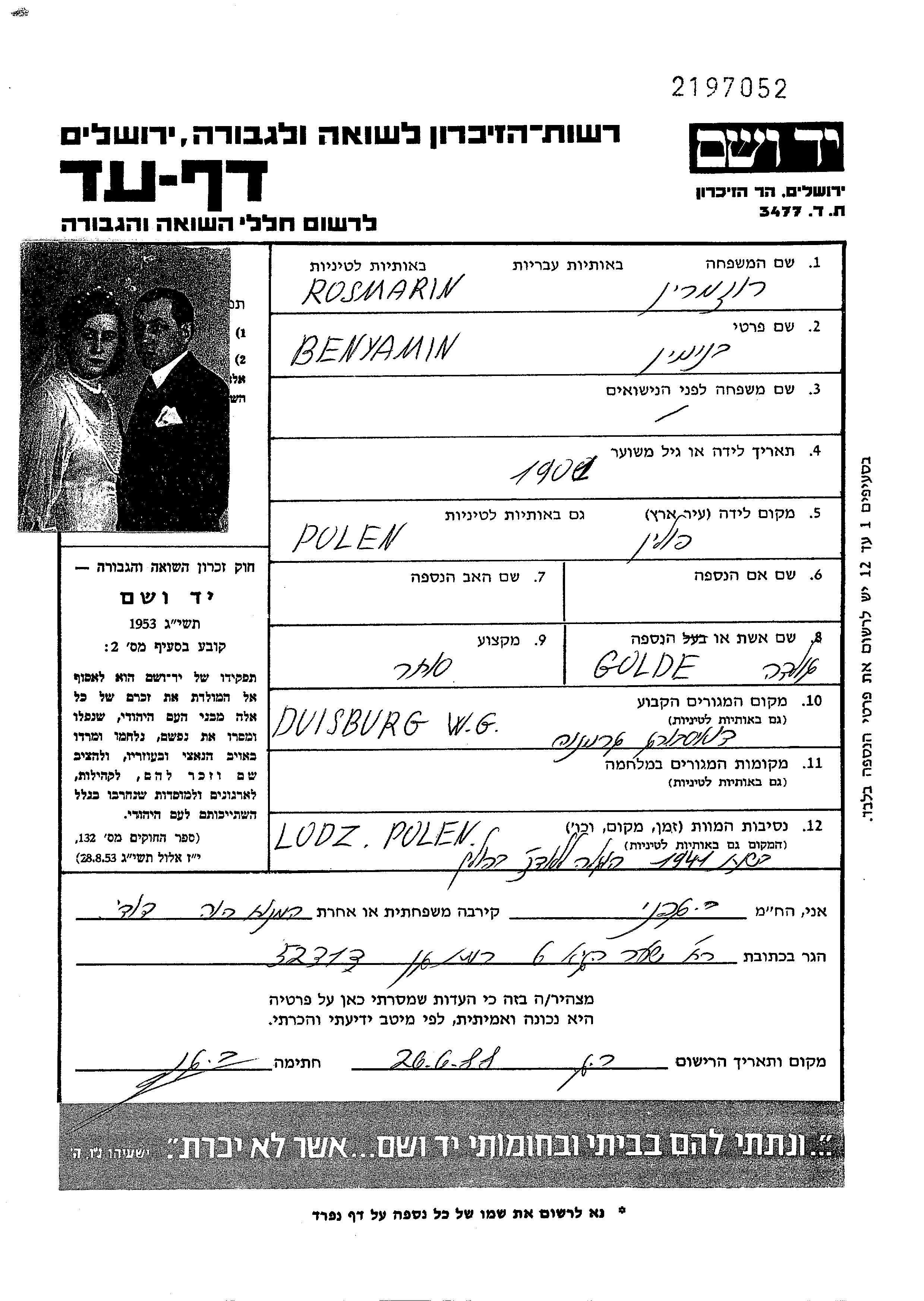 Rozmarin Benyamin 1901 Duisburg, Allemagne Feuille de témoignage