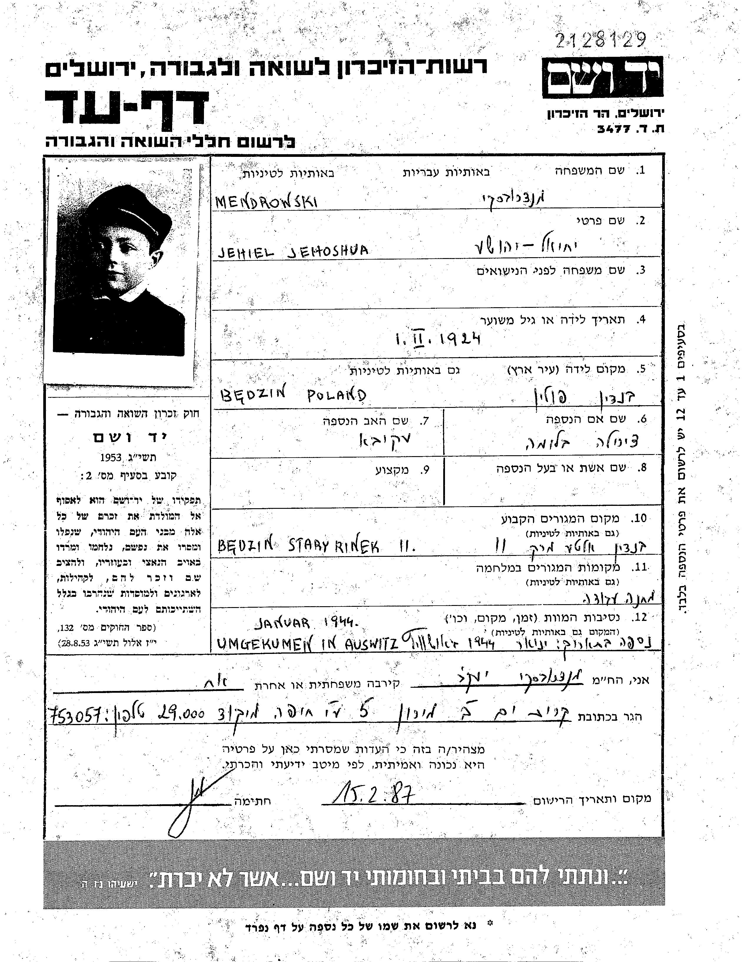 Mendrowski Jehiel Jehoshua 1924 Będzin, Pologne Feuille de témoignage