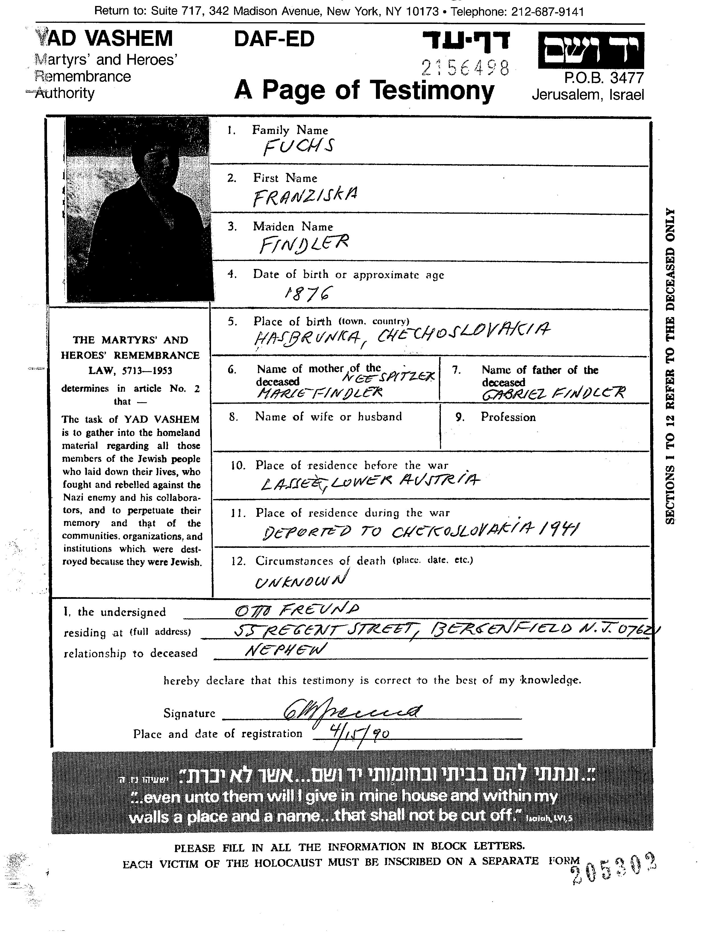 Franziska Fuchs née Findler est née à Hasprunka, Tchécoslovaquie en 1876. Avant la seconde guerre mondiale elle vivait à Lassee, Autriche.