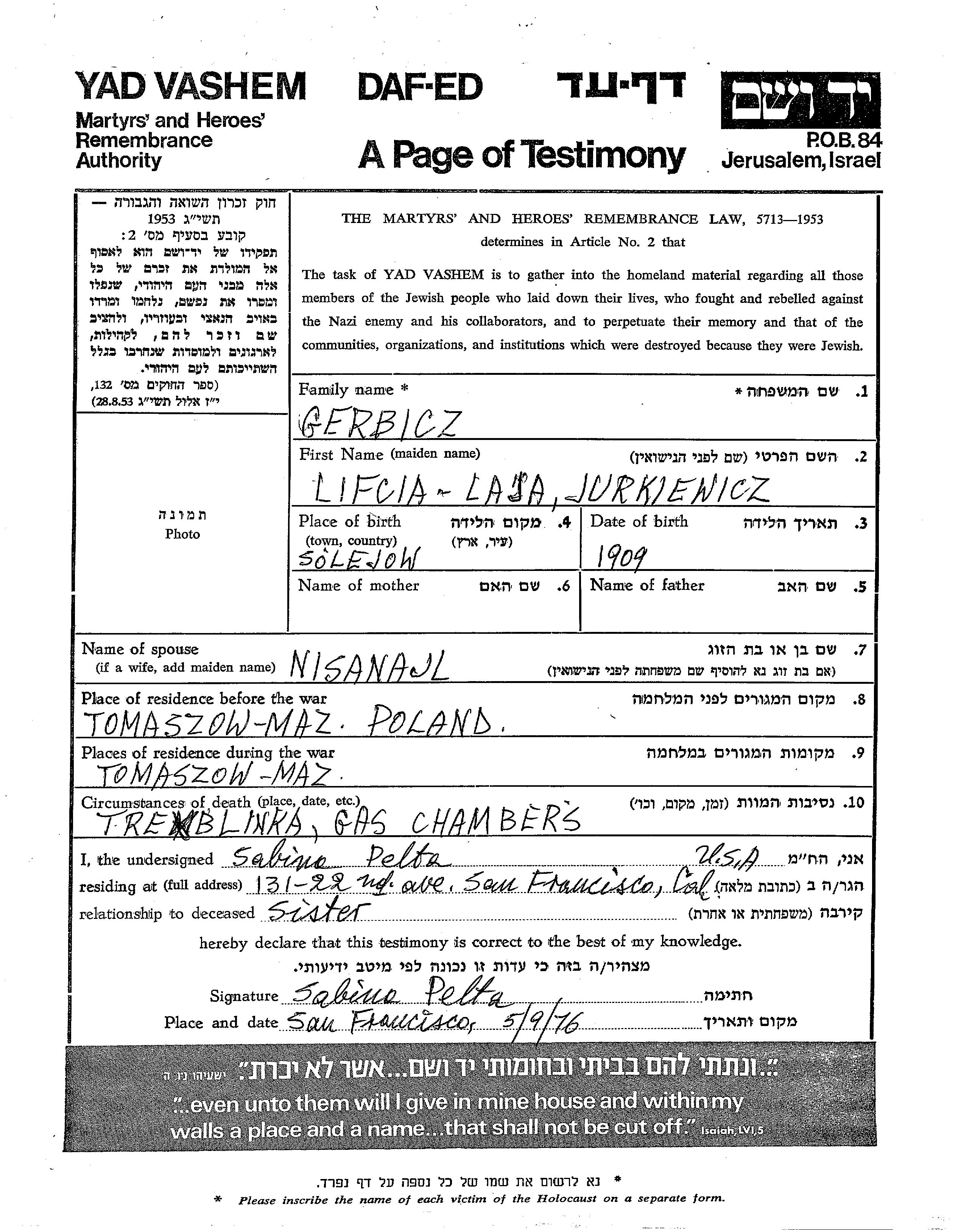 Lifcia Lasa Gerbicz née Jurkiewicz est née à Sulejow, Pologne en 1909. Avant la seconde guerre mondiale elle vivait à Tomaszow Mazowiecki, Pologne.